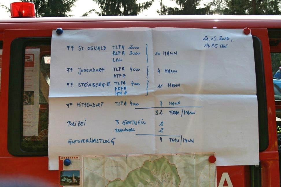 FF St. Oswald b. Plankenwarth – St. Bartholomä, FF Steinberg-Rohrbach, FF Judendorf-Straßengel, FF Hitzendorf mit neun Einsatzfahrzeugen und 35 Feuerwehrmitgliedern, weiters die Polizeiinspektion Gratwein und der Kriminaltechnische Dienst mit insgesamt vier Personen
