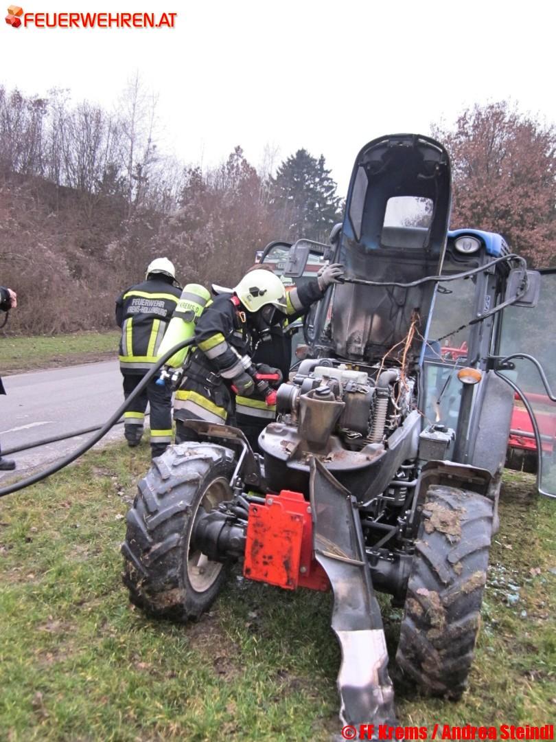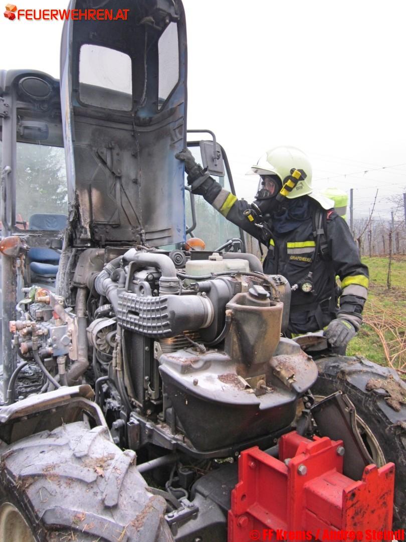 Die Erkundung des Einsatzleiters ergab: Bei der Bearbeitung seines Weingartens ist einem Weinhauer der Traktor während der Fahrt in Brand geraten. Ersthelfer, die auch die Feuerwehr alarmiert hatten, hatten bereits versucht, mittels tragbarer Feuerlöscher den Brand zu löschen bzw. einzudämmen. Die Einsatzkräfte übernahmen dann, unter Vornahme eines Hohlstrahlrohres, die Brandbekämpfung und konnten schließlich den Brand komplett ablöschen.