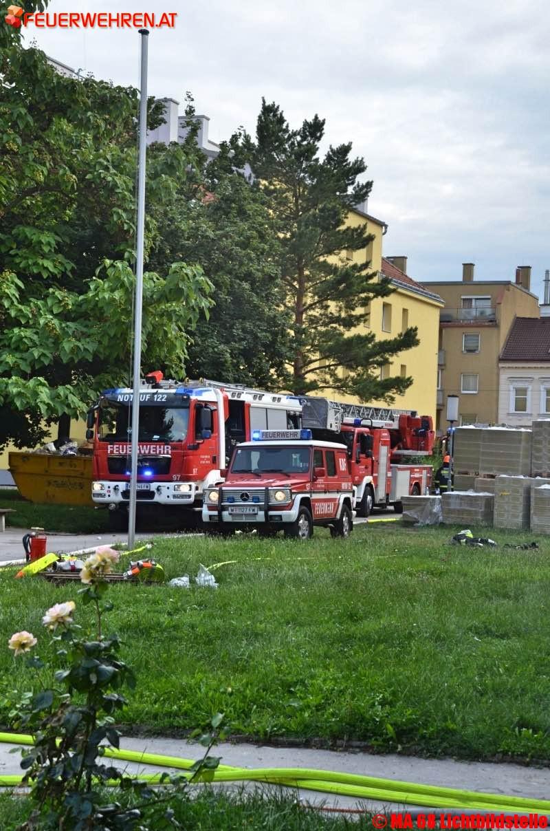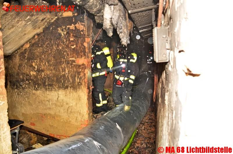 Aus bisher unbekannter Ursache waren im Keller einer weitläufigen Wohnhausanlage in der Prager Straße Lagerungen auf einer Fläche von etwa zehn Quadratmetern in Brand geraten. Bei Ankunft der Berufsfeuerwehr Wien waren bereits zwei Stiegenhäuser und weite Teile des verwinkelten Kellers stark verraucht, da mehrere Verbindungstüren offen standen.