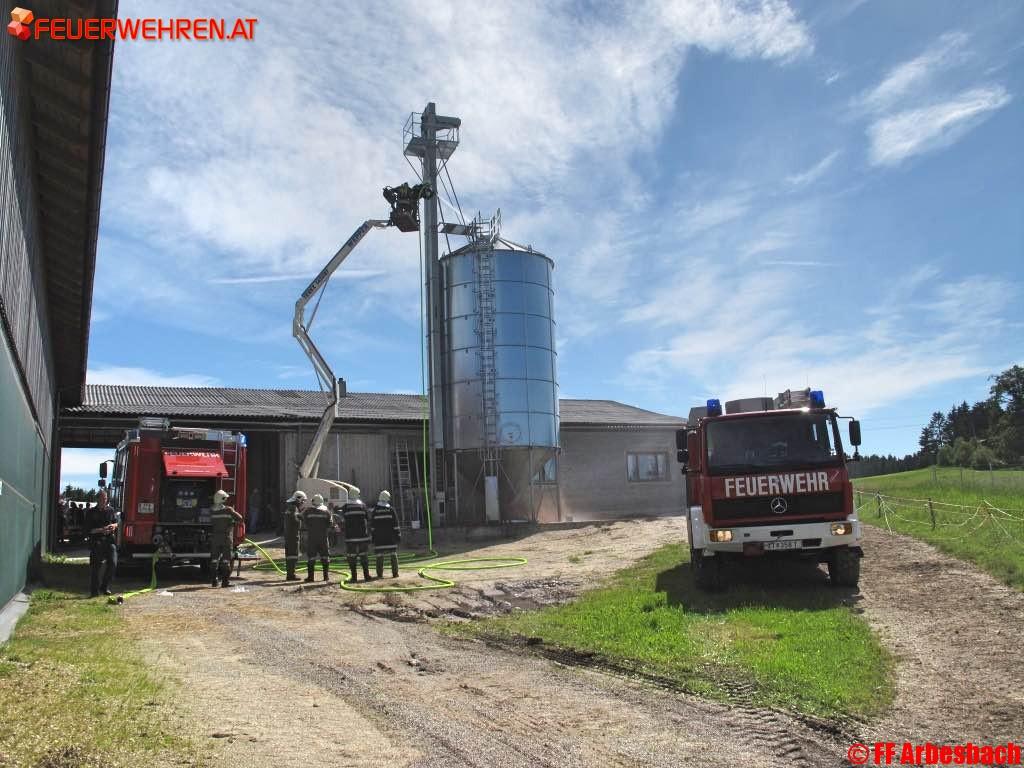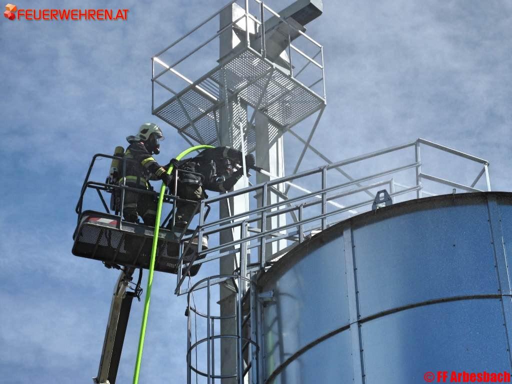 Mitglieder der FF Arbesbach sind mithilfe des Hubsteigers vor Ort und unter schwerem Atemschutz auf die Oberseite des Silos aufgestiegen und haben den Silo mit Wasser „geflutet“. Die Glutnester wurden am Boden abgelöscht. Interessant hierbei war dass sich der Trockentorf, ähnlich wie Ölbindemittel, nicht mit Wasser verbindet.