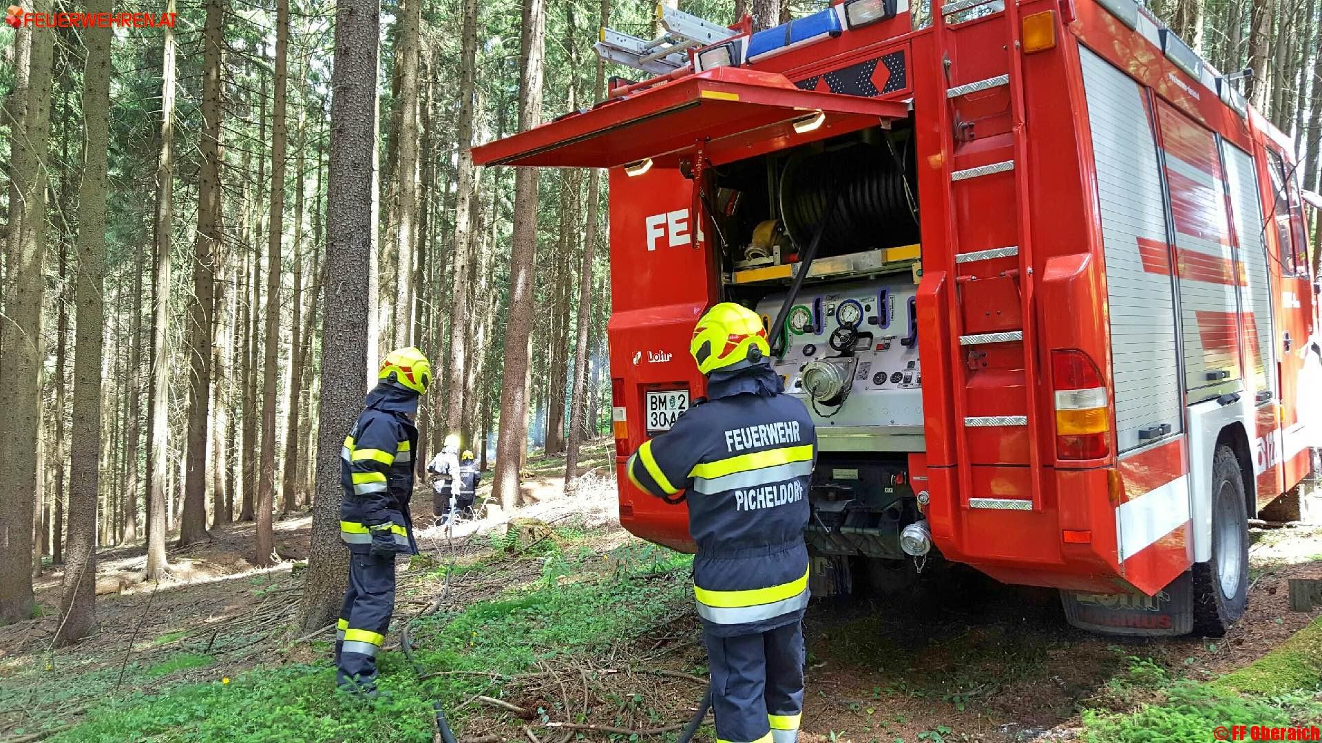 Der Einsatzbefehl lautete: „Waldbrand am Aichberg von der B116 und S6 bereits sichtbar“. Da der Rauch bereits vom Feuerwehrhaus sichtbar war rückte der Zugskommandant sofort zur Erkundung aus. Auf Anfahrt wurde aufgrund der Lage bereits die Feuerwehr Picheldorf nachalarmiert.