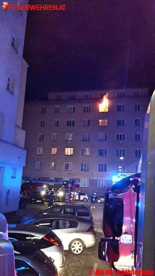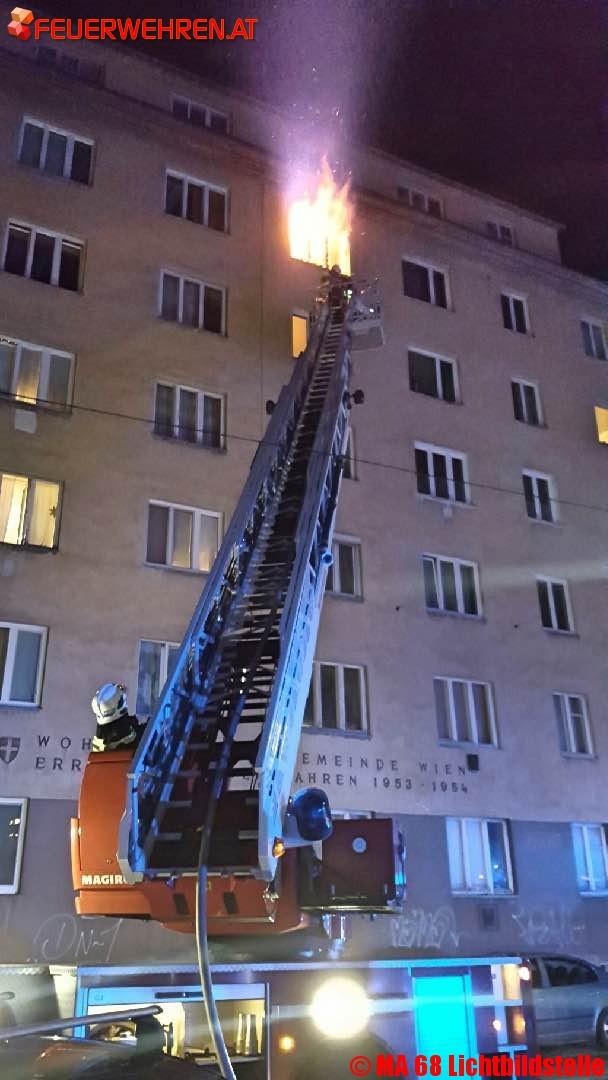 Als die ersten Einsatzkräfte der Berufsfeuerwehr Wien kurz nach Mitternacht eintrafen, war bereits ein Fenster der im fünften Geschoß liegenden Wohnung zerstört und es gab einen starken Flammenaustritt aus diesem Fenster.