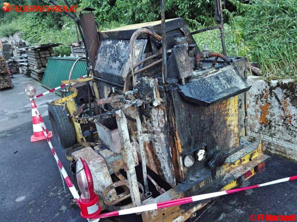 Am 18. 07. 2016 um 07.37 Uhr wurde die Feuerwehr Mariazell zur Unterstützung der ortszuständigen Feuerwehr Gußwerk zu einen Brandeinsatz in der Straßenmeisterei Gußwerk alarmiert. Eine Fugenvergussmaschine geriet aus noch unbekannter Ursache in Brand. Kurz darauf hat das Feuer auf eine der zwei an der Maschine angebrachten Propangasflaschen übergegriffen.
