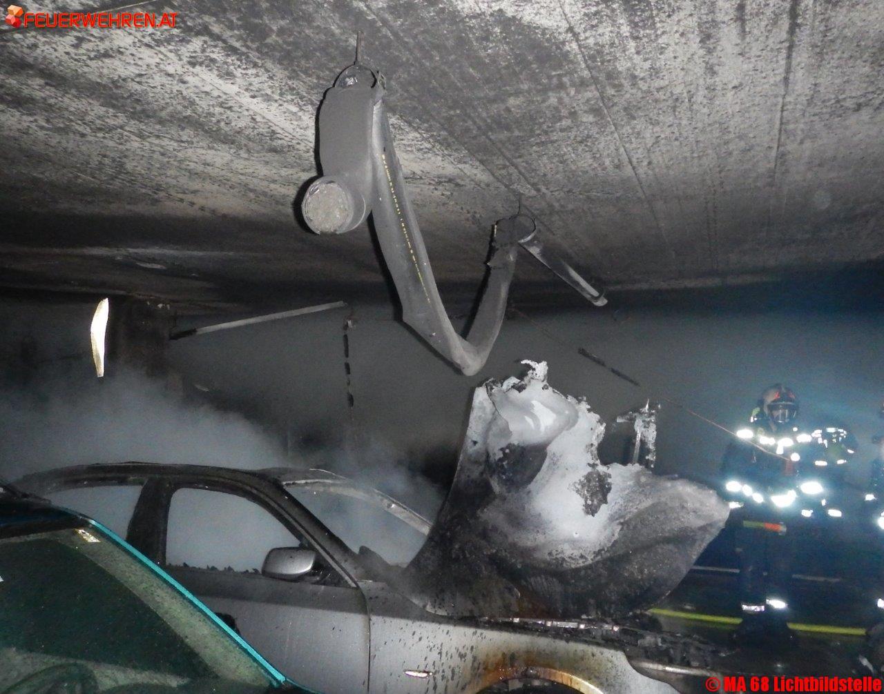 Von den erstankommenden Feuerwehrkräften wurde im Zuge der Erkundung der Brand mehrerer Fahrzeuge im angrenzenden Parkdeck festgestellt und umgehend eine Löschleitung unter Atemschutz zur Brandbekämpfung vorgenommen. Zur Erzielung einer besseren Löschwirkung wurde dem Löschwasser ein spezielles Schaummittel zugesetzt.
