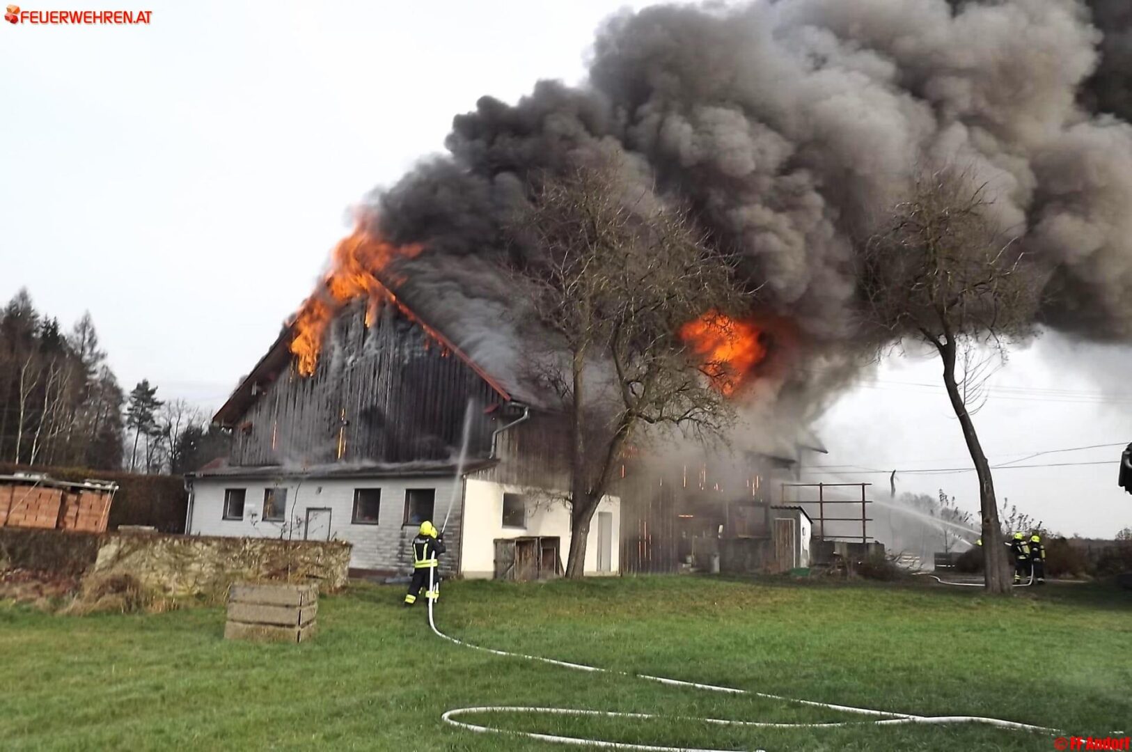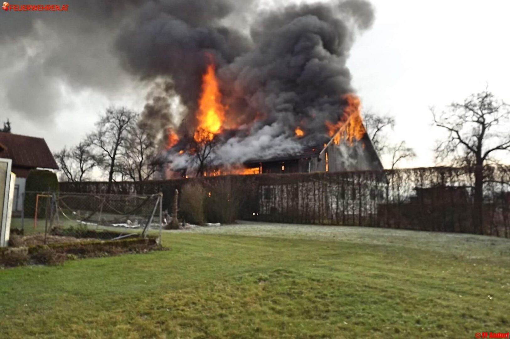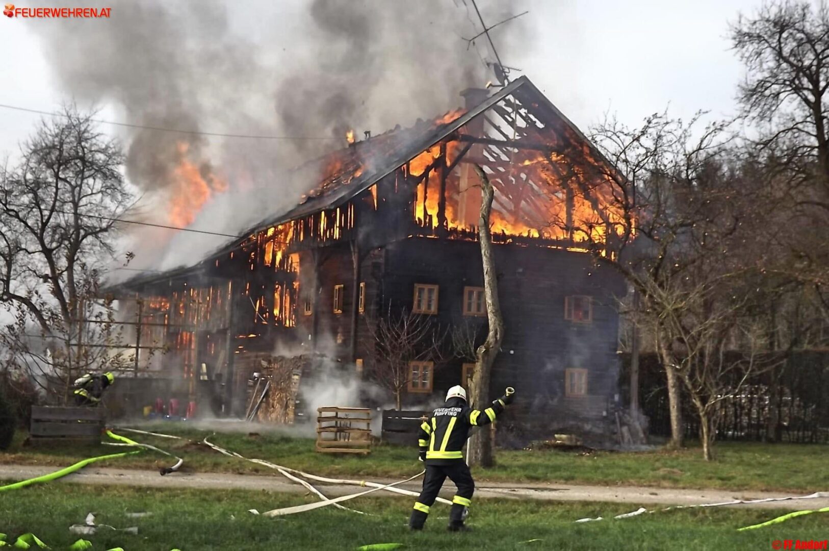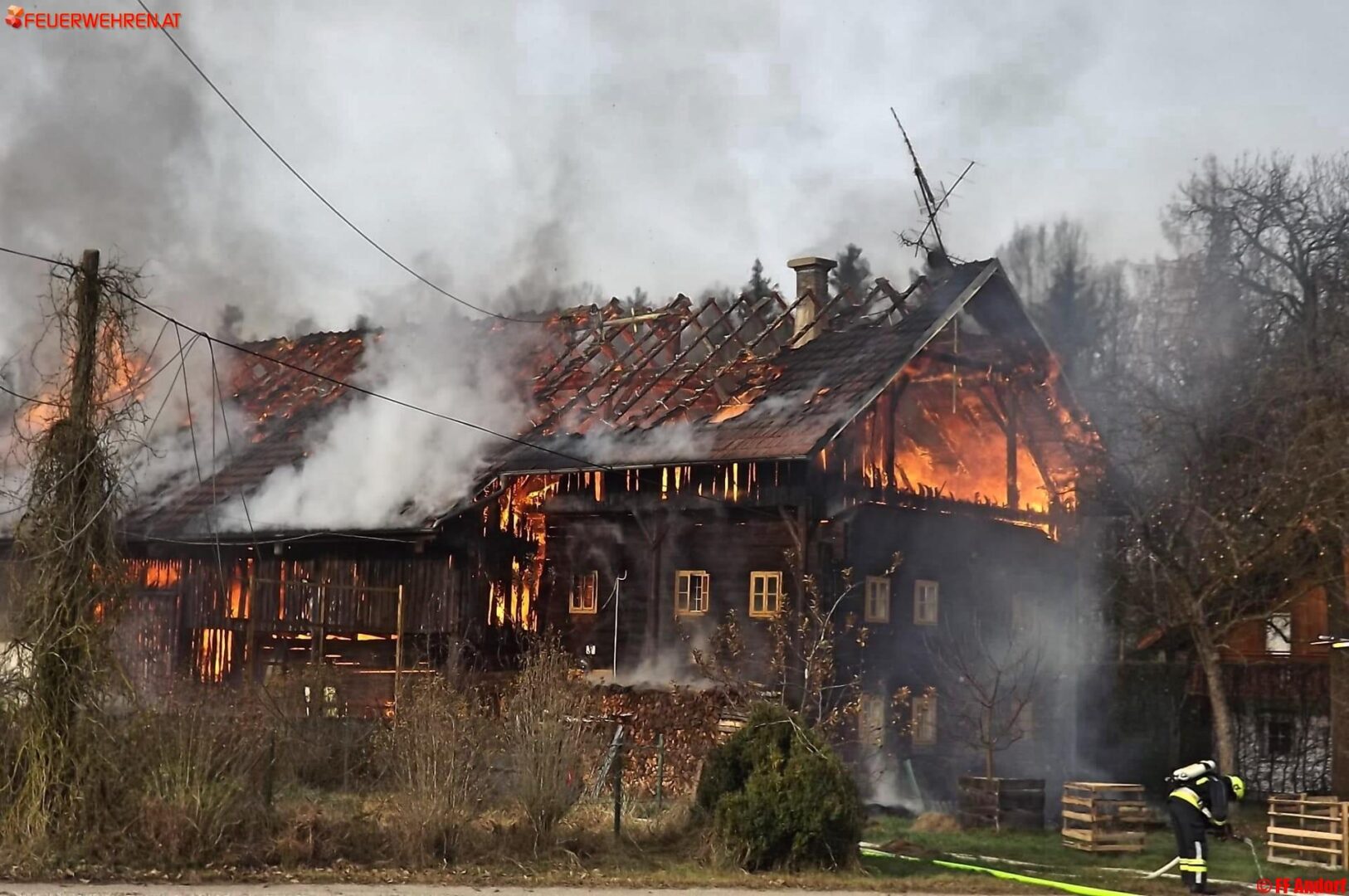 Aus bislang unbekannter Ursache geriet heute kurz nach Mittag ein Wohnhaus in der Ortschaft Teuflau (Gemeinde Andorf) in Brand. Beim Eintreffen der ersten Einsatzkräfte stand das gesamte Objekt bereits in Vollbrand und wurde deshalb sofort Alarmstufe 2 ausgelöst. Kurz darauf standen 10 Feuerwehren mit etwa 150 Einsatzkräften am Brandort um die Flammen zu bekämpfen und ein Übergreifen auf die Nachbarobjekte zu verhindern.