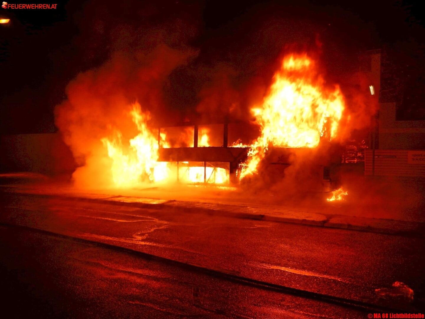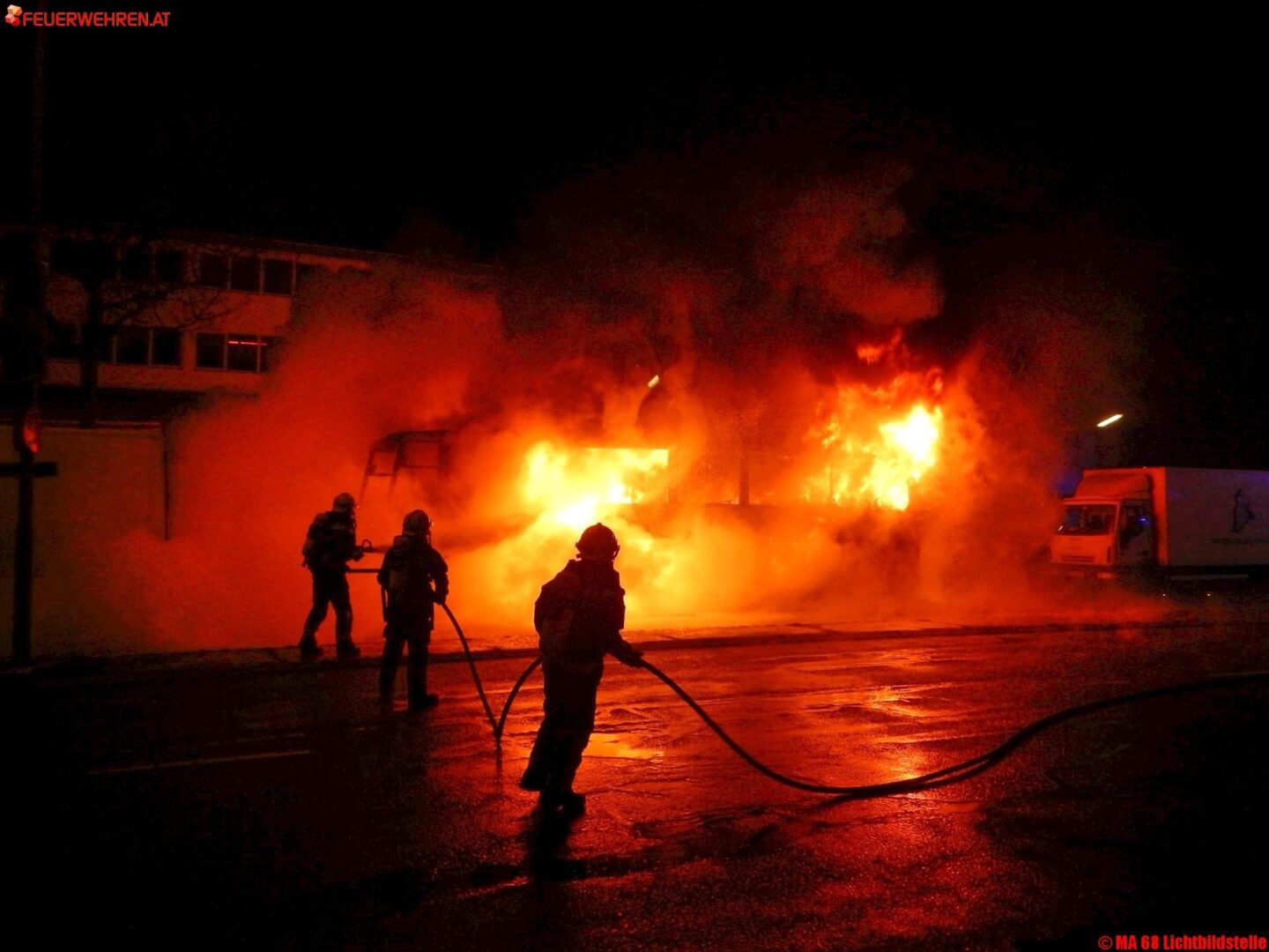 Heute Nacht kam es in Wien Liesing aus ungeklĂ€rter Ursache zu einem Brand eines geparkten Reisebusses. In weiterer Folge schlugen die Flammen auf das Heck eines in unmittelbarer NĂ€he geparkten Lkws ĂŒber.
