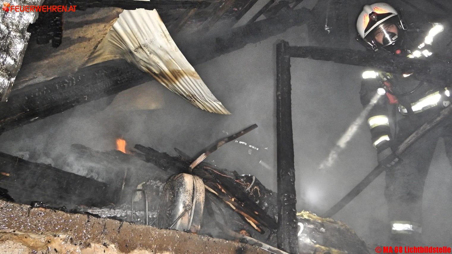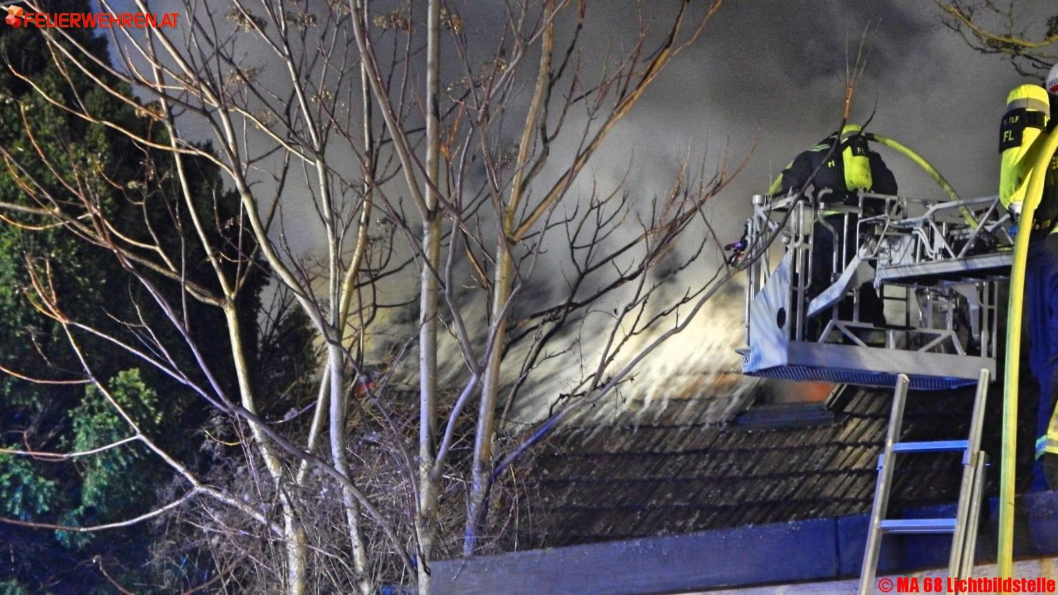 Durch den Vollbrand des Daches waren die direkt angrenzenden Objekte massiv durch das Feuer bedroht. Die Berufsfeuerwehr Wien versuchte erfolgreich mit fünf Löschleitungen und dem Wasserwerfer eines Feuerwehrfahrzeuges den Brand unter Kontrolle zu bringen und ein Überspringen des Feuers auf angrenzende Häuser zu verhindern. Dazu wurde auch Löschschaum eingesetzt und knapp eineinhalb Stunden nach der Alarmierung konnte „Brand aus“ gegeben werden.