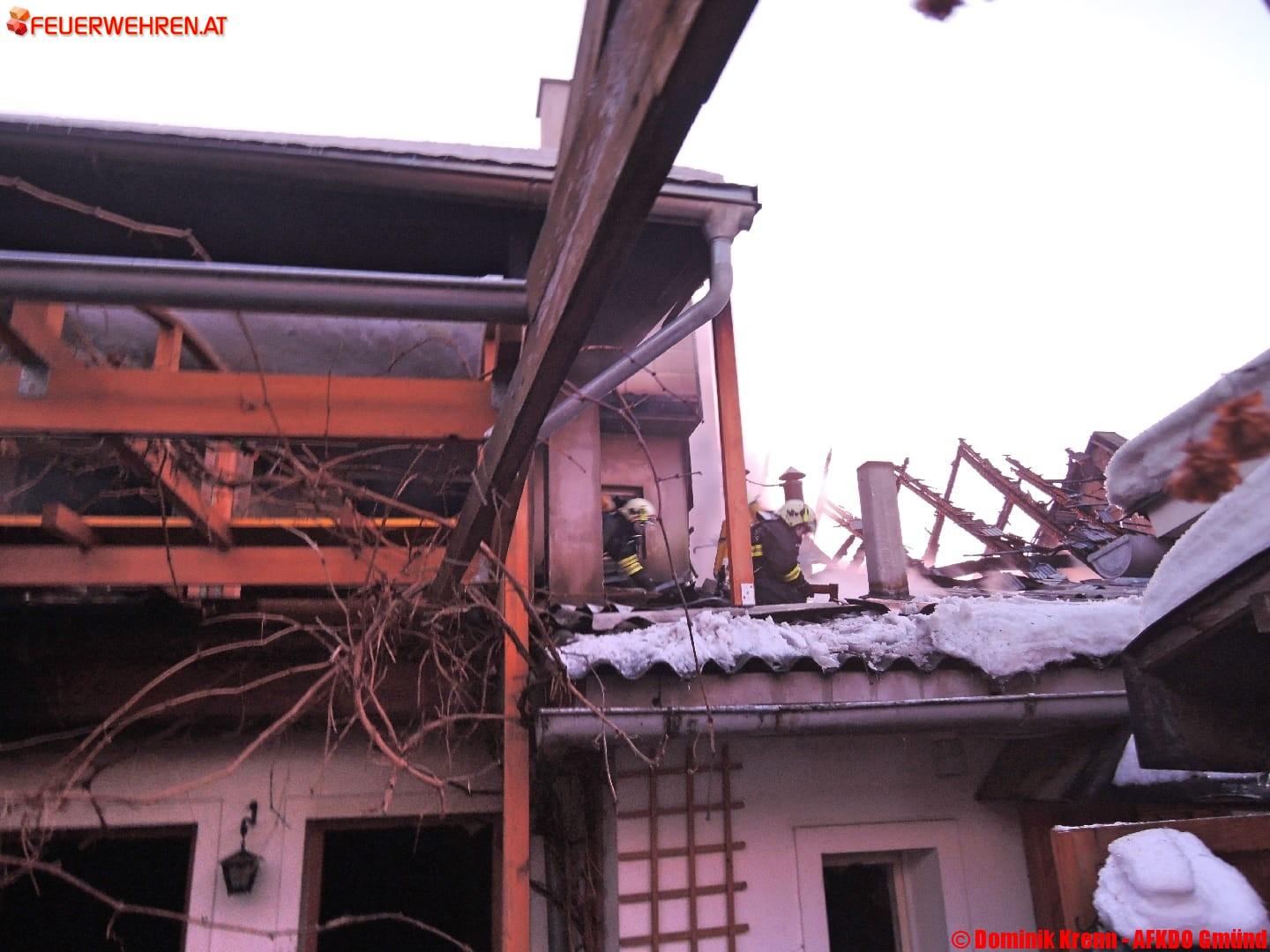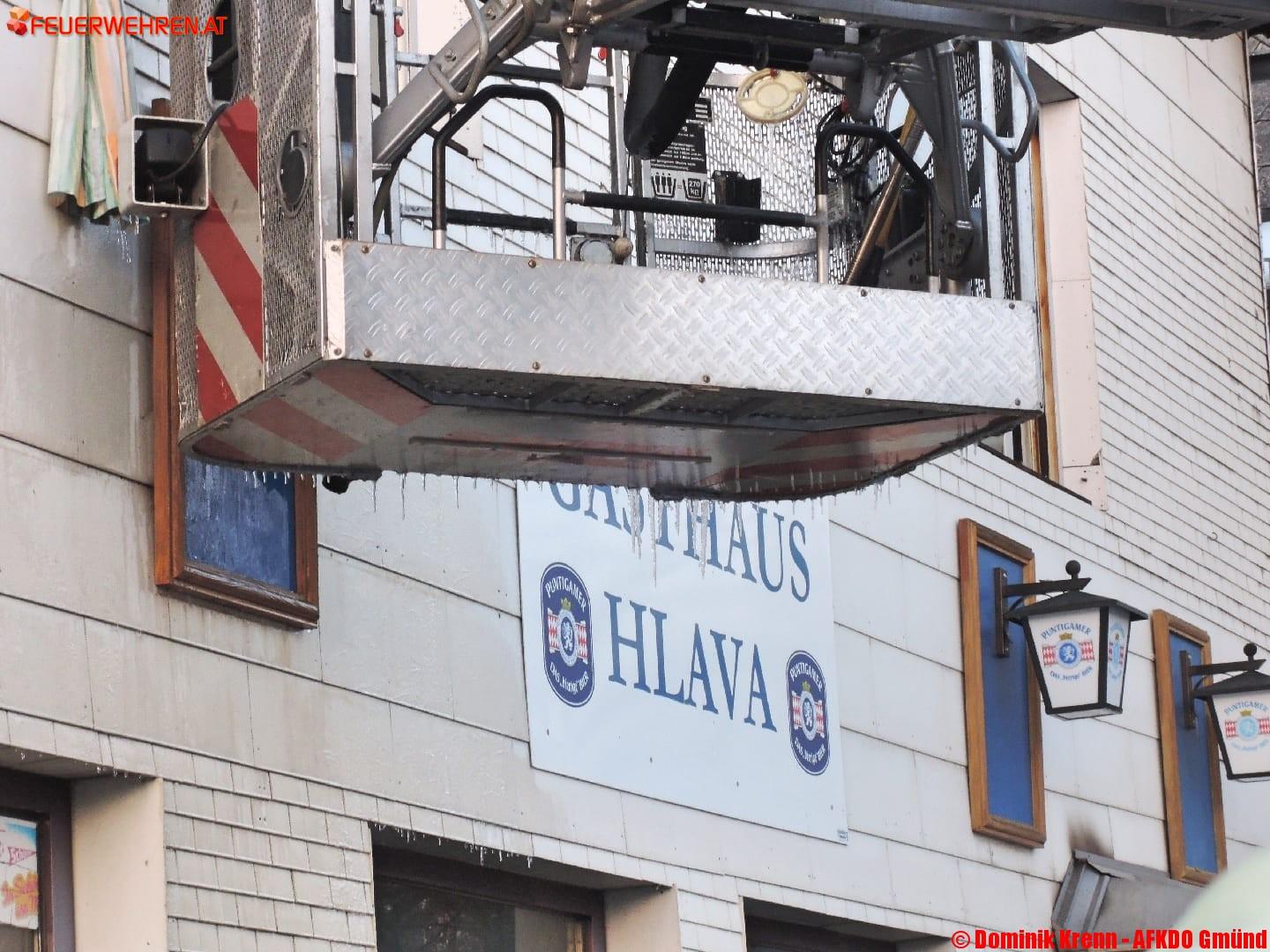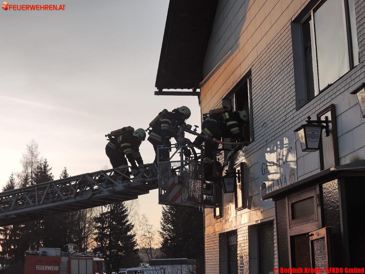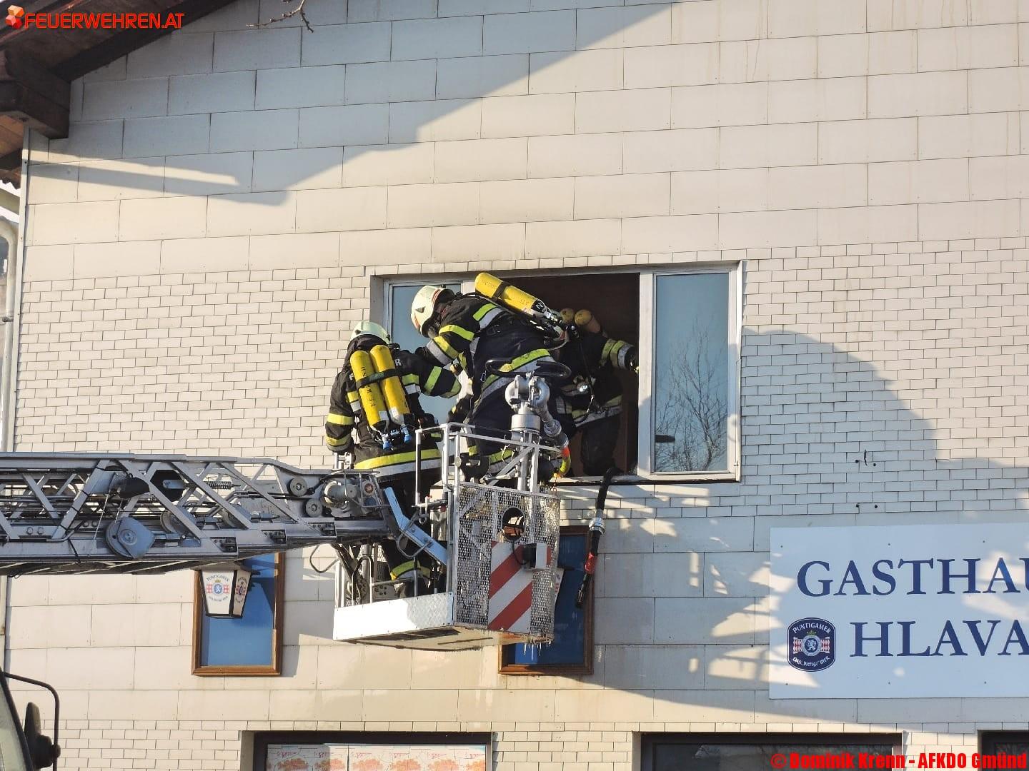Um in das Obergeschoß des total zerstörten Hauses vordringen zu können wurde die Drehleiter der Freiwilligen Feuerwehr der Stadt Schrems eingesetzt. Ein Zugang über das Treppenhaus war nicht mehr möglich. Außerdem wurde in der Erstphase der Dachstuhlbrand im hinteren Teil des ehemaligen Gasthauses vorgenommen. Die Freiwillige Feuerwehr der Stadt Gmünd stellte ihre Telemast-Bühne zur Verfügung um das Dach nach versteckten Glutnestern zu untersuchen.