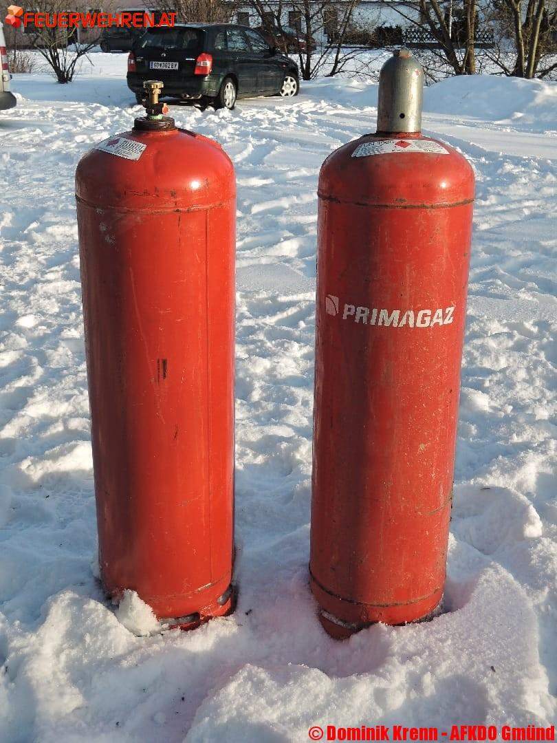 Da das Gasthaus über eine Flüssiggasanlage verfügte, mussten die außen am Haus gelagerten Flaschen rasch in Sicherheit gebracht werden. Der Blechschrank rund um die beiden 33kg Flaschen wurde geöffnet, die Behälter von der Gasleitung getrennt und in sicherer Entfernung in den kalten Schnee gestellt.