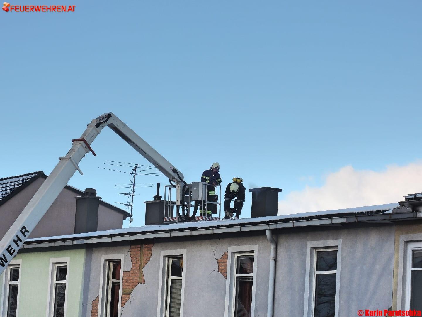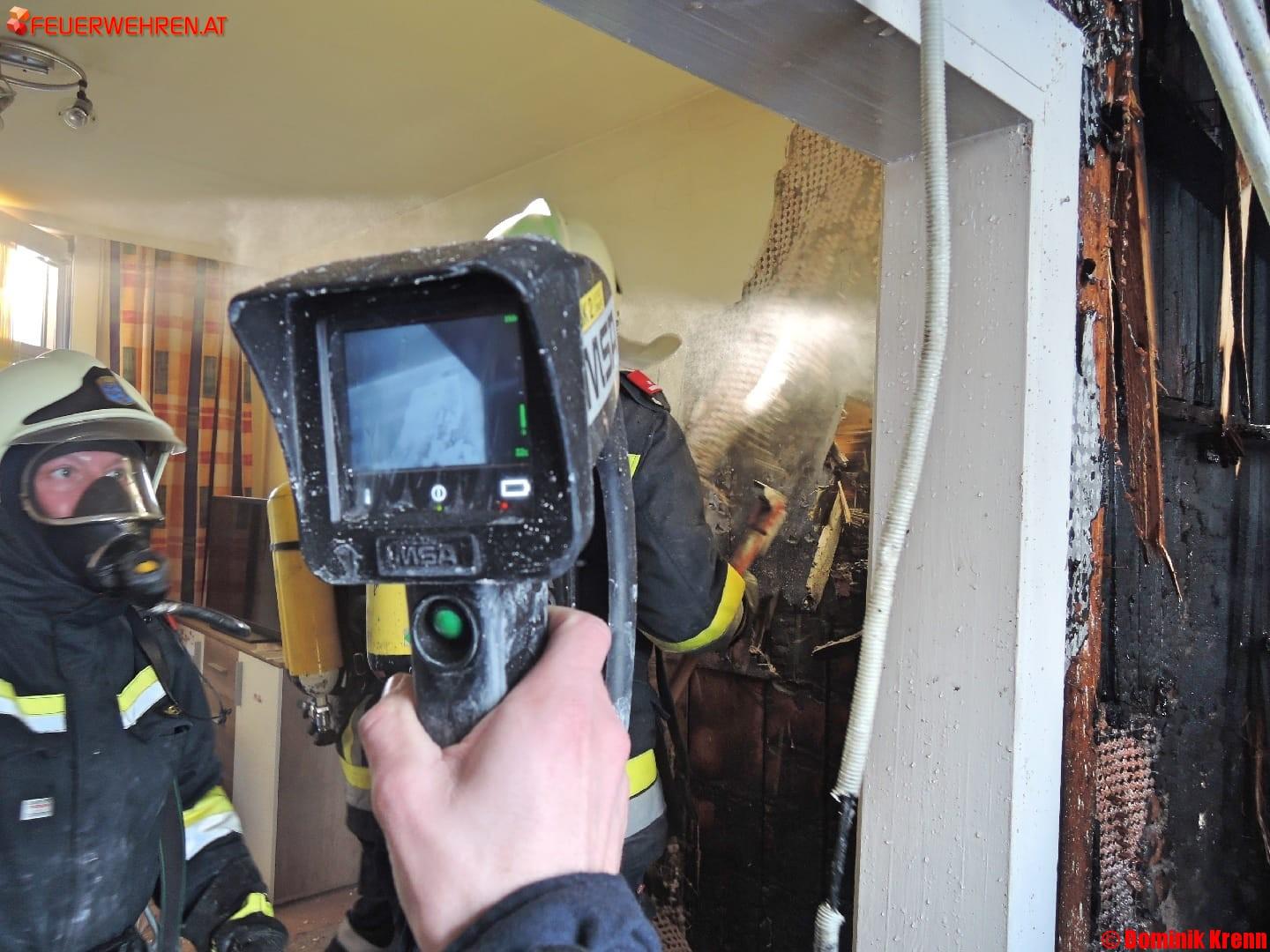 Bereits während der Anfahrt der angeforderten Feuerwehren wurde bereits der Brand rund um die betroffene Feuerstelle Großteils abgelöscht werden und die Wände nach weiteren Glutnestern abgesucht werden. Mit Hilfe eines Spezialwerkzeuges der Tschechischen Feuerwehr konnte das Dach geöffnet und abgesucht werden. Glücklicherweise wurde der Brand rechtzeitig entdeck und bekämpft, um ein Übergreifen und eine Zerstörung des Daches zu verhindern.