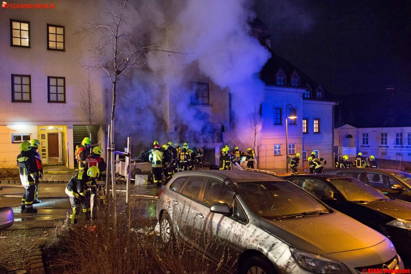 Mehrere Bewohner meldeten am 13.03.2017 kurz nach 02:00 Uhr eine Explosion über den Feuerwehrnotruf. Wenige Minuten später rückten die Kameraden der Freiwilligen Feuerwehr Hollabrunn zum Einsatzort aus. Bereits auf der Anfahrt erhöhte Einsatzleiter Christian Holzer die Alarmstufe und löste somit Alarm für 6 weitere Feuerwehren aus.