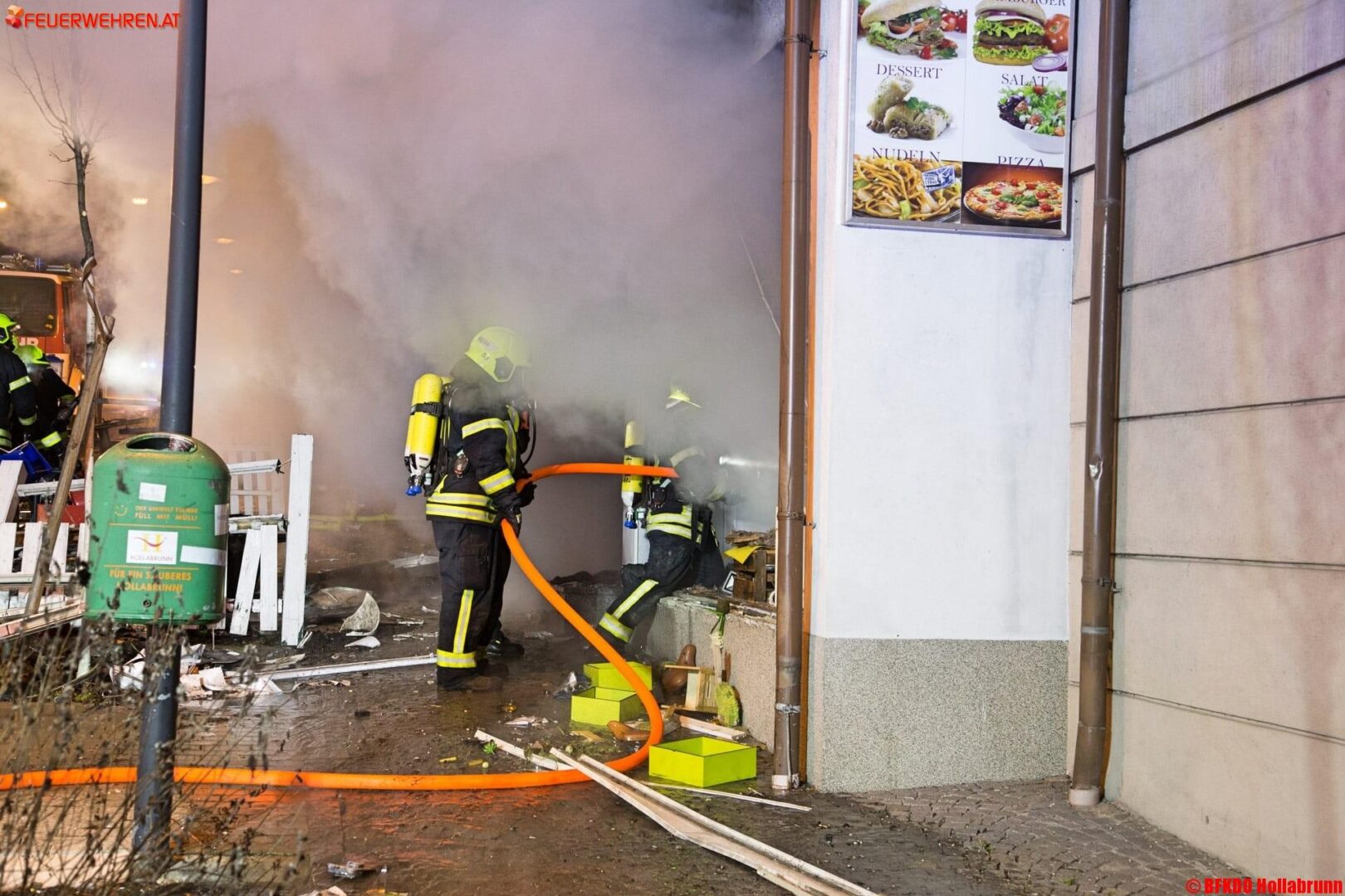 Beim Eintreffen der Feuerwehr stand ein Pizzaladen im Ortszentrum in Vollbrand. Durch die Wucht der Explosion wurden im Umkreis des Gebäudes die Scheiben von Fahrzeugen und Geschäften zerstört. Umgehend wurden durch die Feuerwehren etwa 20 Wohnungen im gleichen Gebäude evakuiert. Zusätzlich wurden alle Wohnungen auf Kohlenmonoxid kontrolliert.