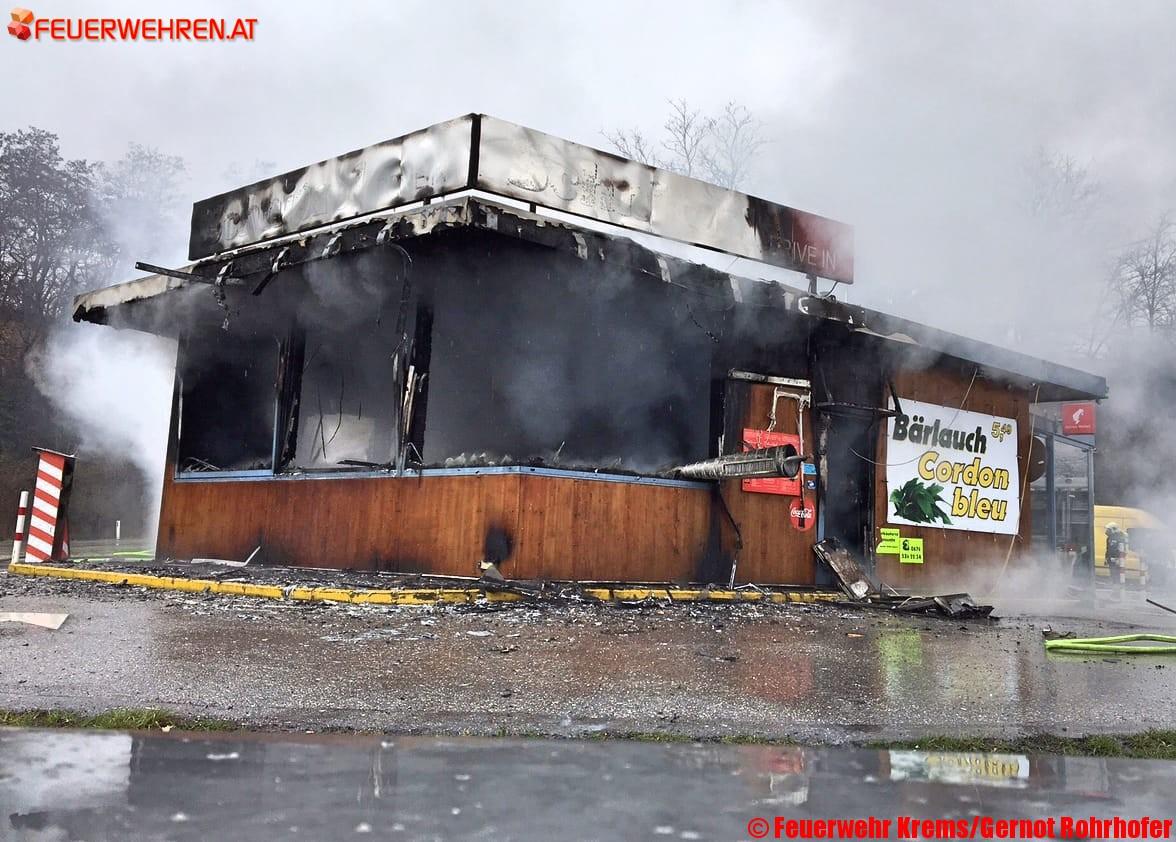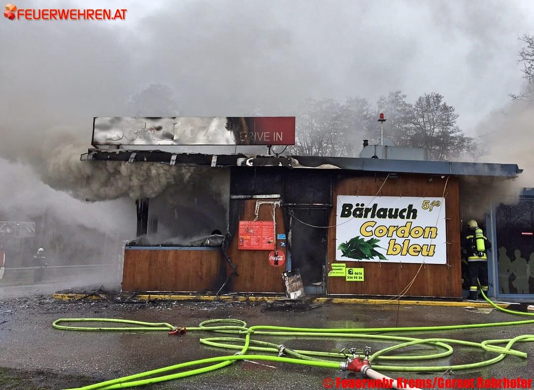 Großeinsatz für die Freiwillige Feuerwehr Krems am späten Sonntagvormittag: In der Küche eines Imbisslokals zwischen Krems und Gneixendorf ist aus vorerst unbekannter Ursache ein Brand ausgebrochen. Große Teile des Gebäudes brannten aus. Mitarbeiter und Gäste konnten sich rechtzeitig in Sicherheit bringen.