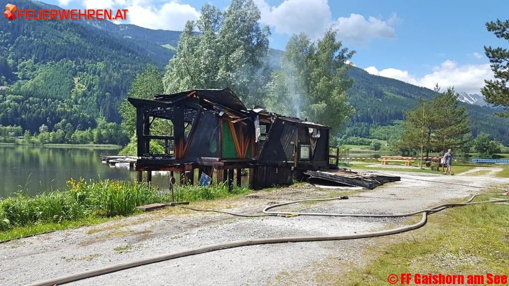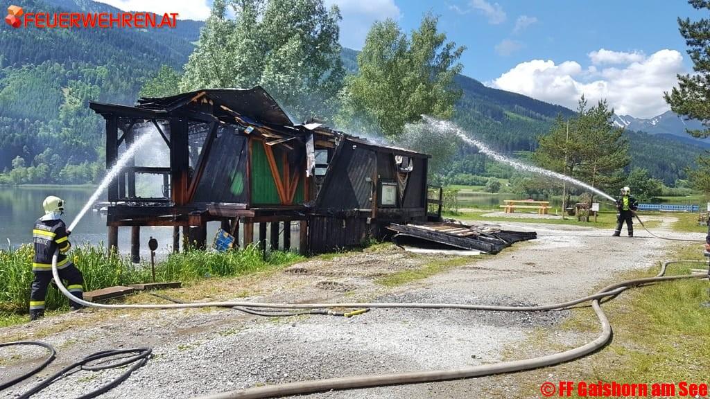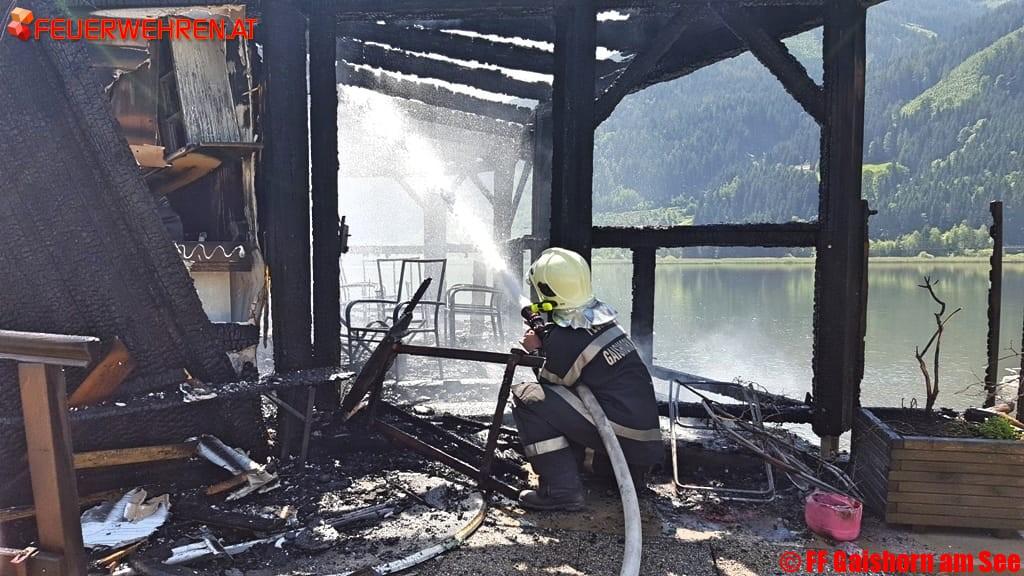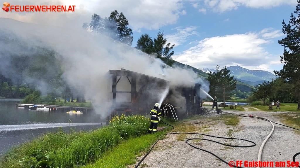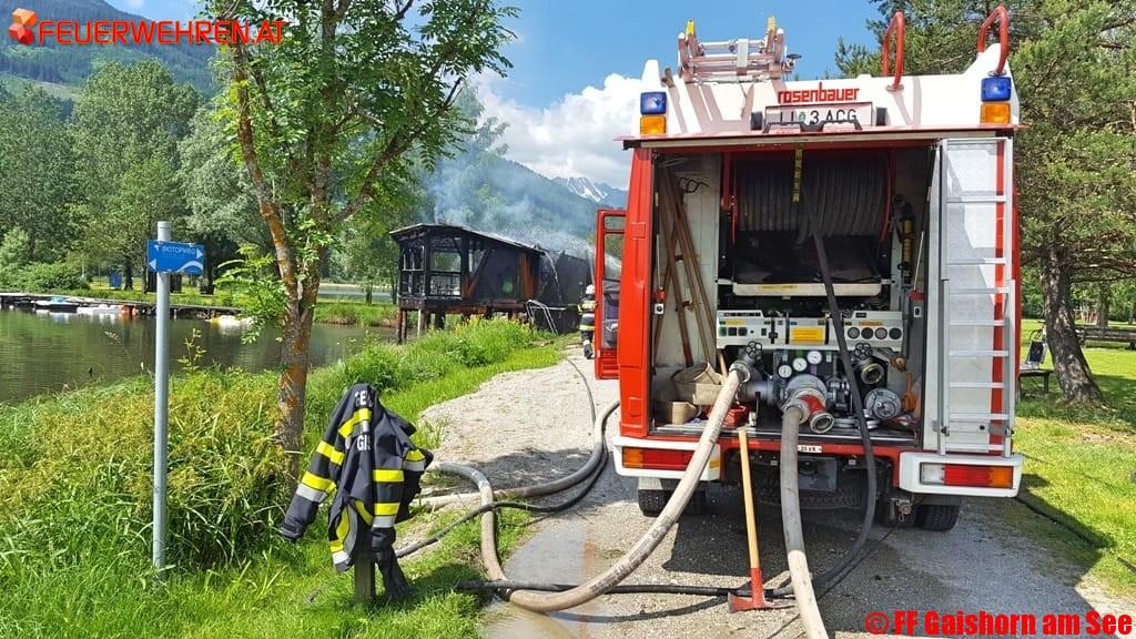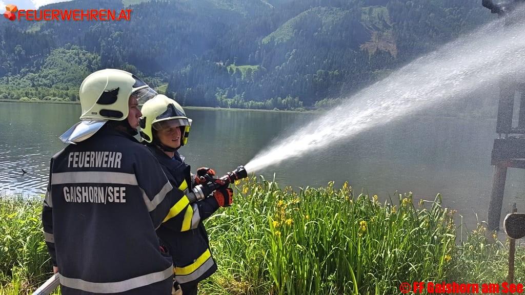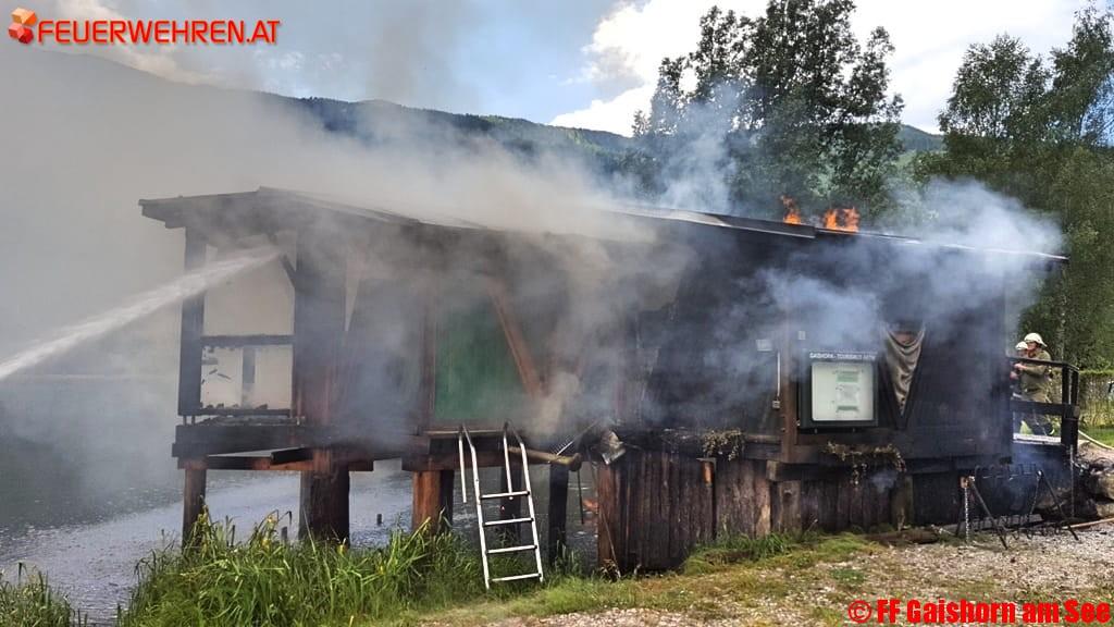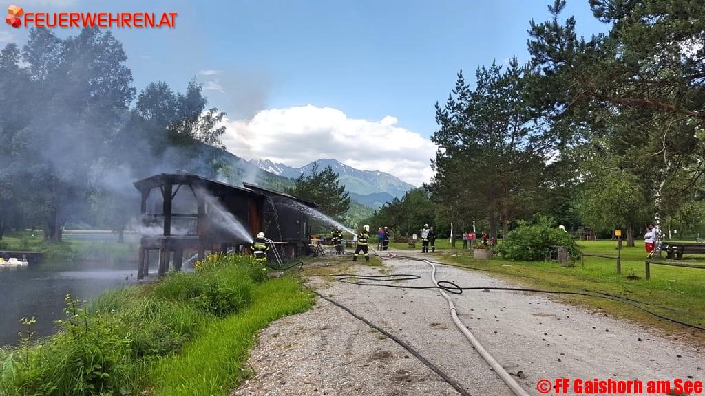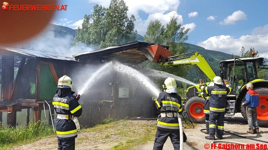 Vor Ort begann die RLFA-Mannschaft sofort mit einem umfassenden Löschangriff unter Zuhilfenahme von 2 C-Rohren sowie dem HD-Schnellangriff, die Wasserversorgung konnte mittels Tauchpumpe durch den See sichergestellt werden. Diese Maßnahmen zeigten schnell Wirkung, so war der Brand bis zum Eintreffen der weiters alarmierten Wehren aus Au, Treglwang und Trieben bereits weitgehend eingedämmt bzw. abgelöscht.