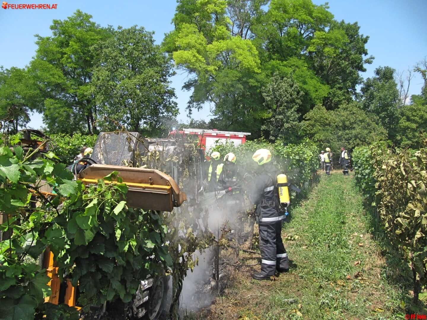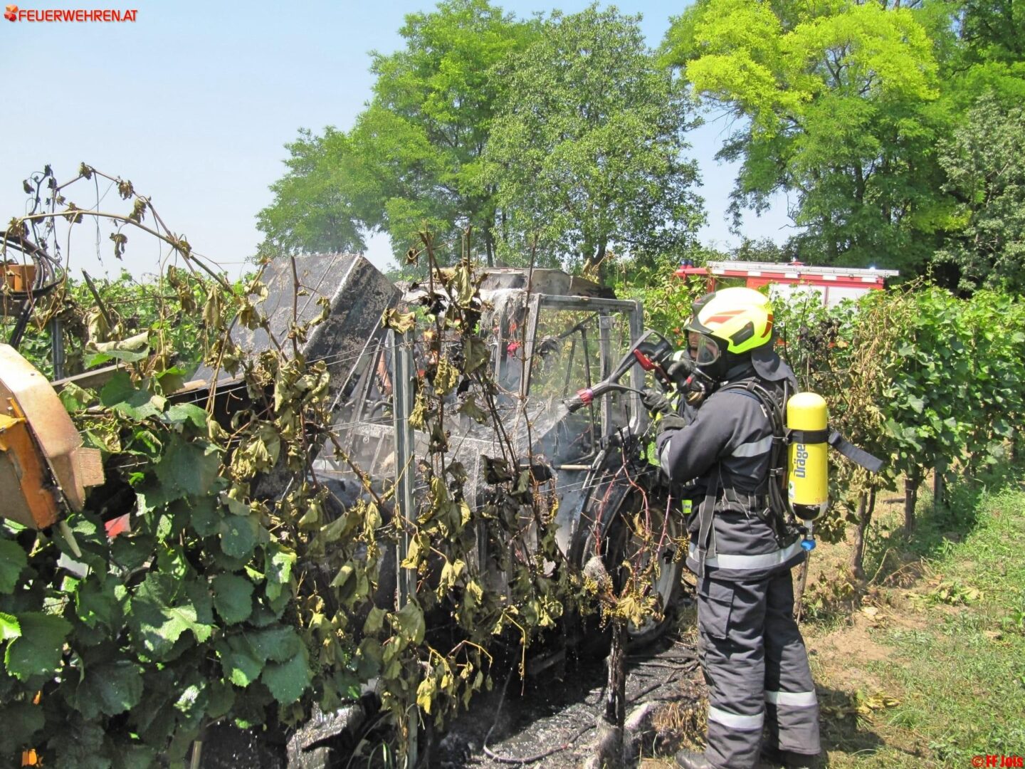 Sofort begann ein Trupp der FF Jois, unter schwerem Atemschutz, mit den Löschmaßnahmen, welche sofort Wirkung zeigten. In dem Traktor befand sich glücklicherweise keine Person mehr. Um 12:14 konnte der Einsatzleiter „Brand aus“ geben. Anschließend wurde, mittels der Wärmebildkamera, noch der gesamte Traktor nach eventuellen Glutnestern durchsucht.