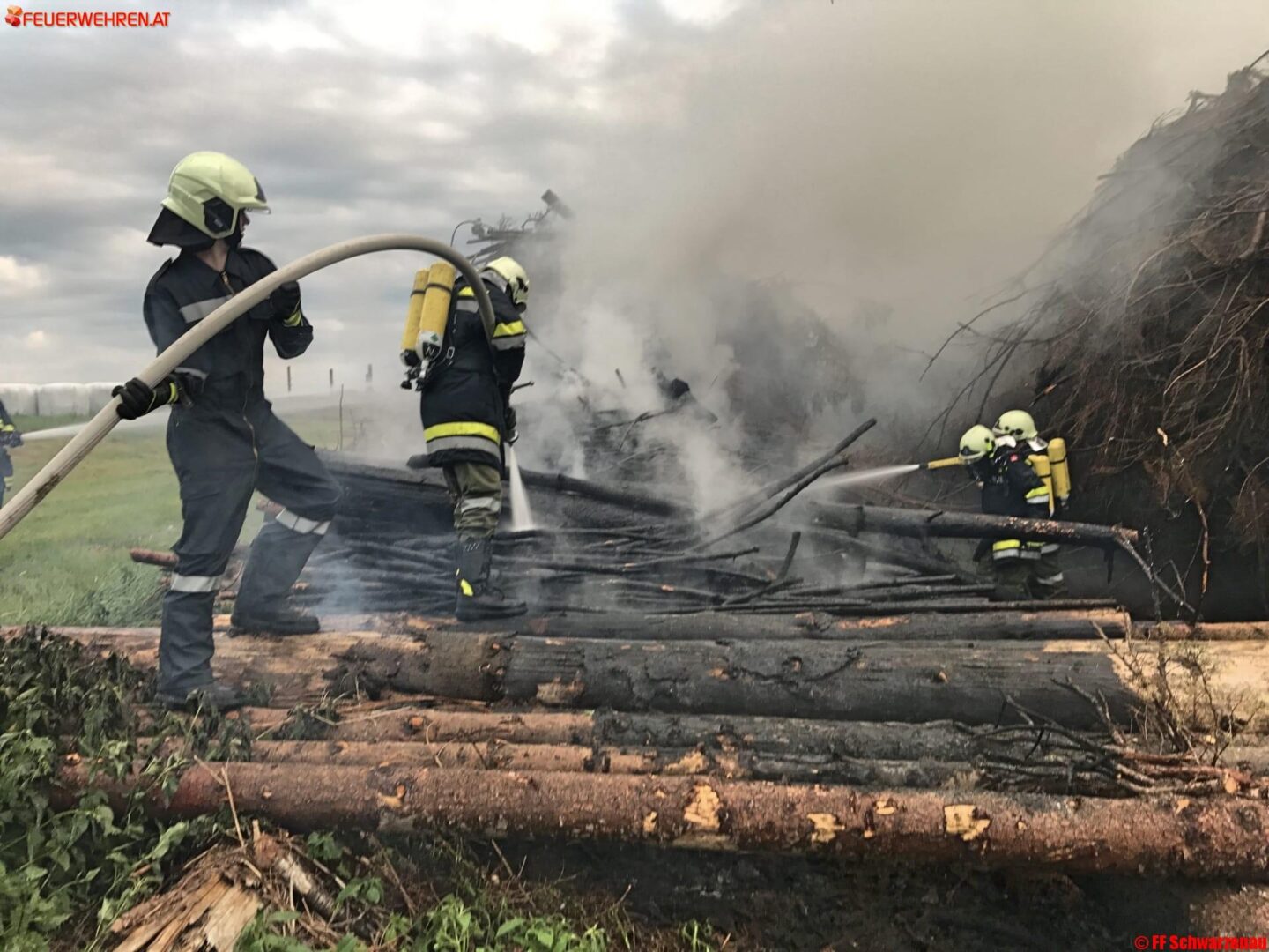 Schon nach kurzer Zeit rückten wir mit unserem Rüstlösch-Fahrzeug Richtung Brandort aus. Bei der Anfahrt über die L67 konnten wir bereits eine Rauchsäule wahrnehmen und die nachfolgenden Fahrzeuge anweisen, beim örtlichen Löschteich eine Zubringerleitung aufzubauen. Am Brandort wurde die Lage erkundet und der Einsatz des Atemschutzes von unserem Gruppenkommandant angeordnet. Mit der Schnellangriffseinrichtung wurde vorerst eine weitere Brandausbreitung auf ein weiteres Hackgutlager verhindert. Nach ein paar Minuten konnten wir bereits die erste Zubringerleitung, welche von der Besatzung unseres KLF aufgebaut wurde, mit Wasser füllen und die Brandbekämpfung mit zwei C-Rohren durchführen. Nach Absprache mit dem örtlich zuständigen Einsatzleiter der FF Großhaselbach wurde auch in Zusammenarbeit eine zweite Zubringerleitung vom Löschteich zum Brandobjekt gelegt.