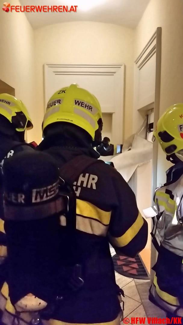 Als die Hauptfeuerwache Villach gemeinsam mit der FF Vassach am Einsatzort eintraf konnte über ein Vordach durch ein gekipptes Fenster in die Wohnung eingestiegen werden. In der verrauchten Wohnung konnte eine ältere Dame im Schlafzimmer ansprechbar vorgefunden werden. Sie wurde mittels Fluchtmaske durch den Rauch ins Freie verbracht und dem Roten Kreuz übergeben, schilderte Einsatzleiter Harald Geissler Kommandant der Hauptfeuerwache. Die Dame wurde zur genaueren Untersuchung mit der Rettung ins LKH Villach verbracht.