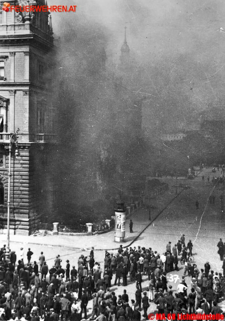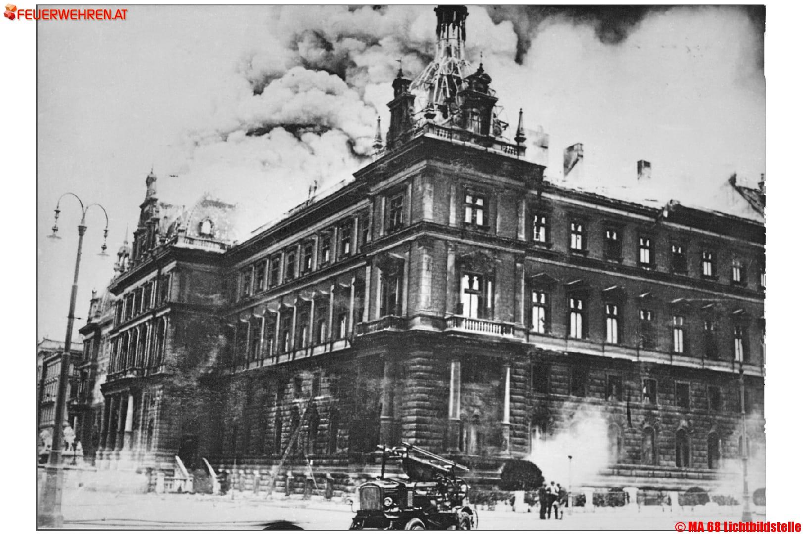 Demonstranten zündeten am 15. Juli 1927 an vielen Stellen und in mehreren Stockwerken des fünfgeschoßigen Justizpalastes Kästen und Regale mit aufgehäuften Akten an, sodass binnen kurzer Zeit mehrere Räume brannten. Die Feuerwehr wurde um 12:28 Uhr alarmiert. Bereits auf der Fahrt zur Einsatzstelle wurden die Fahrzeuge der Feuerwehr behindert und konnten nicht auf direktem Weg zum Brandplatz kommen. Auch beim Justizpalast angekommen, gelang es vorerst nicht die Löschtätigkeit aufzunehmen. Im Gebäude selbst hätte man mit den 12 Wandhydranten einen ersten Löscherfolg erzielen können.