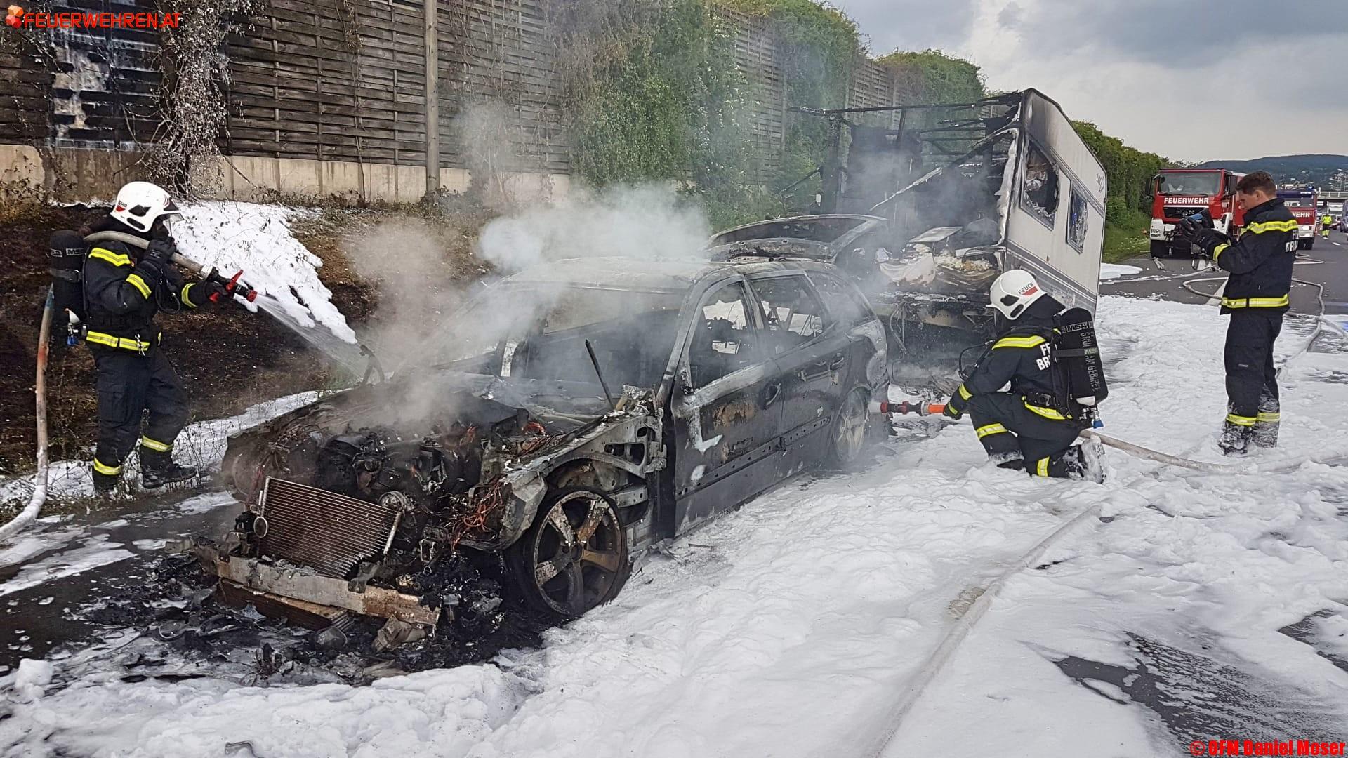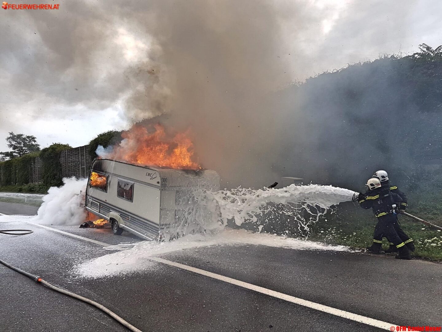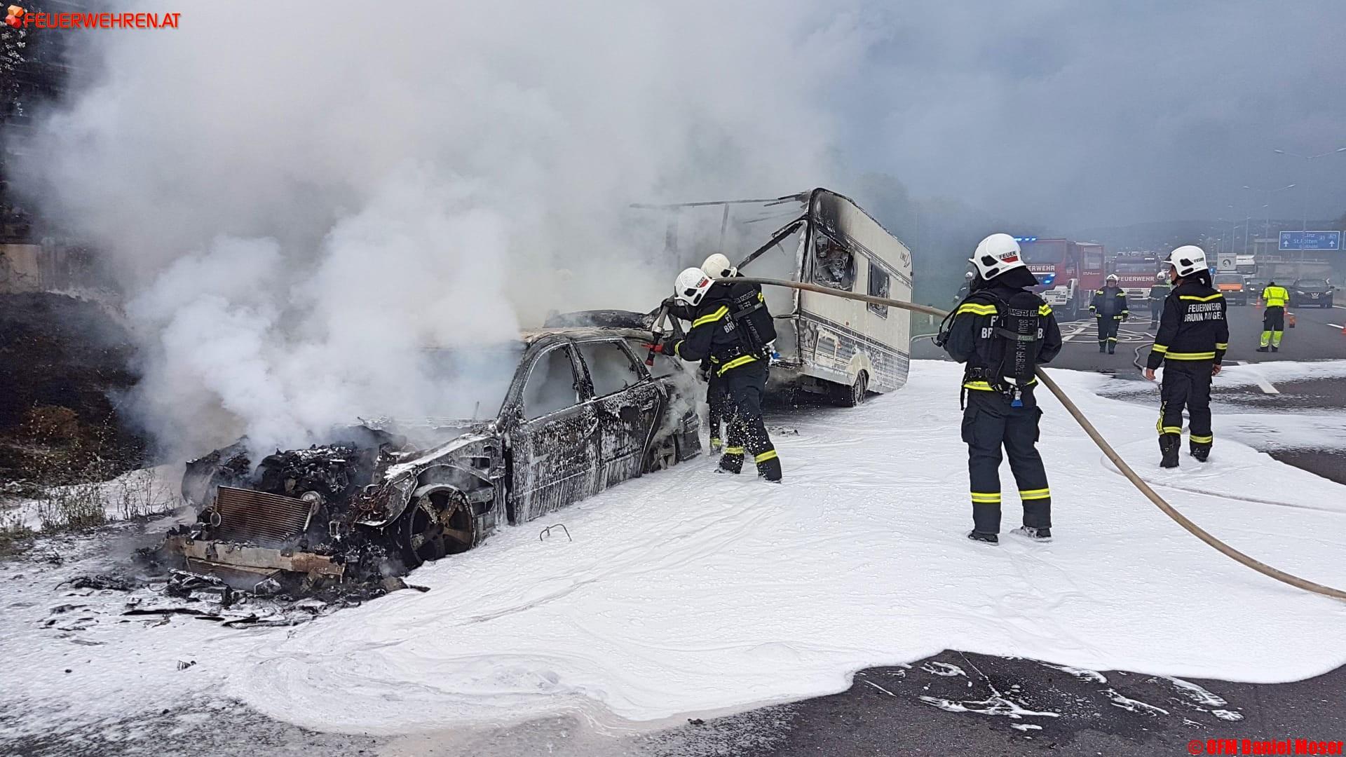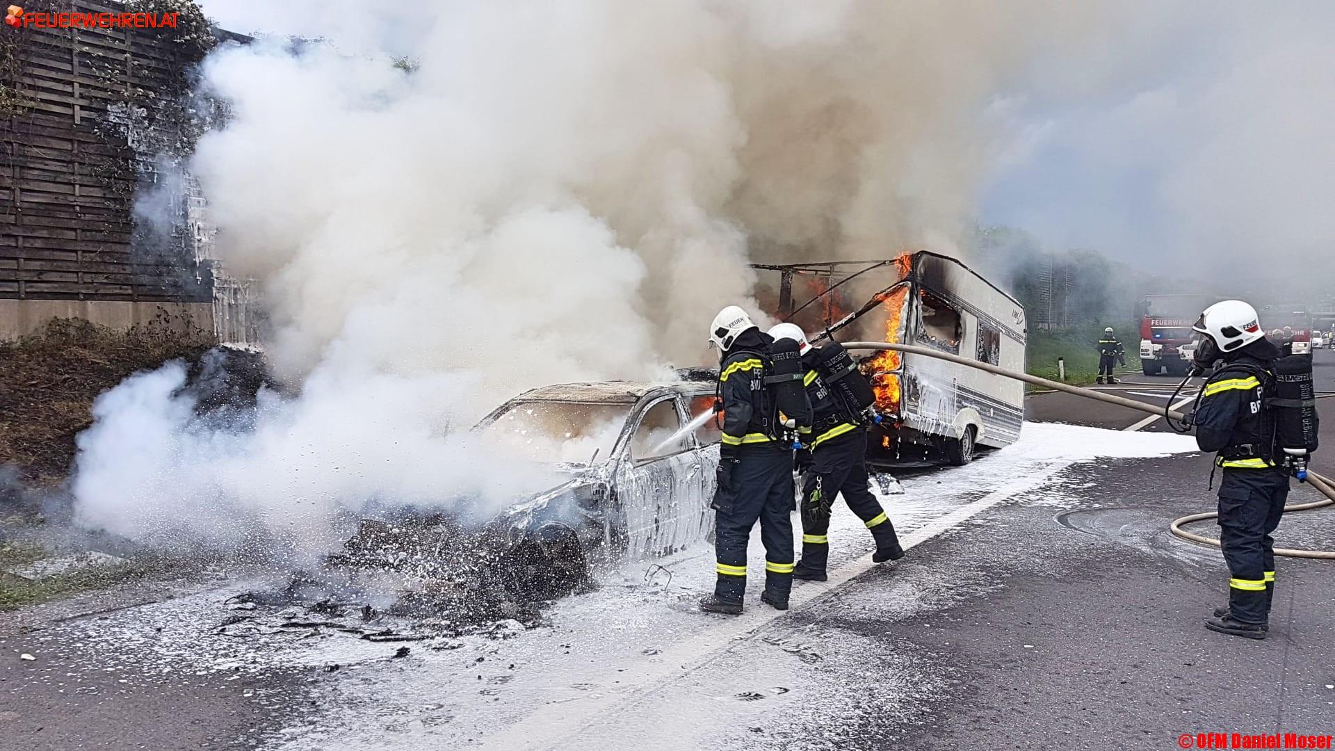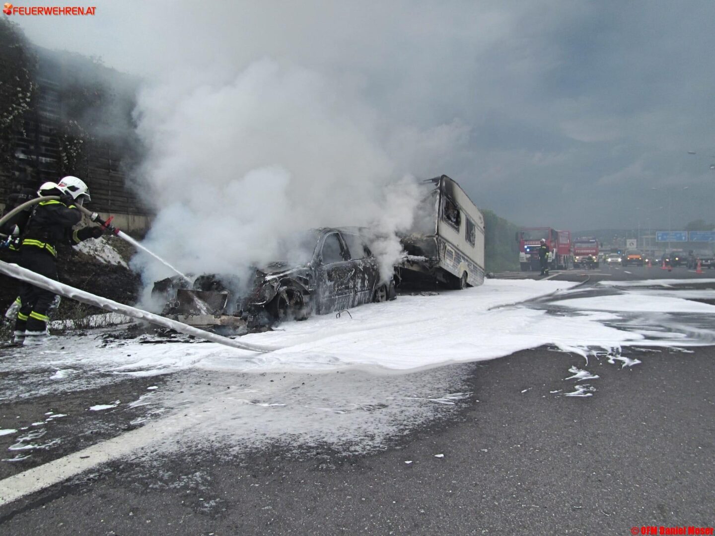 Um 12:36 Uhr heulten, aufgrund eines brennenden Wohnwagengespanns auf der A21 Richtung Vösendorf, die Sirenen in Brunn am Gebirge. Beim Eintreffen der Freiwilligen Feuerwehr Brunn am Gebirge standen PKW wie Wohnwagen in Vollbrand. Eine vierköpfige dänische Familie, welche sich in dem Fahrzeug befand, konnte sich glücklicherweise rechtzeitig in Sicherheit bringen. Die Eingesetzten Kräfte der Feuerwehr Brunn starteten den Löschangriff mit zwei Mittelschaumrohren, welche zu einem raschen Löscherfolg führten. Eine im Wohnwagen befindliche Gasflasche konnte entfernt und gekühlt werden.