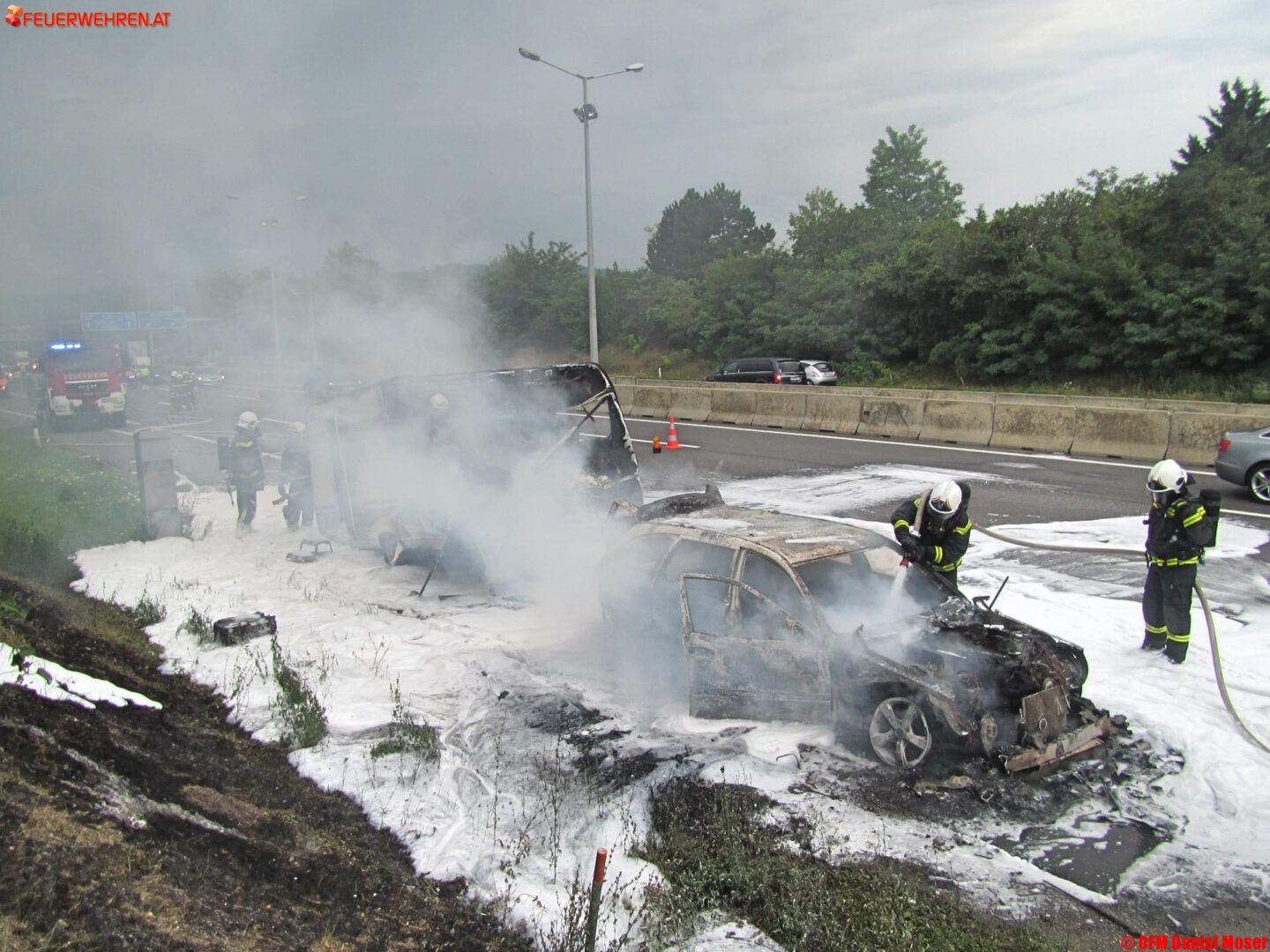 Während der Nachlöscharbeiten veranlasste der Einsatzleiter die Alarmierung der Freiwilligen Feuerwehr Gießhübl sowie der Freiwilligen Feuerwehr Wiener Neudorf, jeweils mit deren PKW-Abschleppfahrzeugen um die völlig ausgebrannten Fahrzeuge rasch von der Autobahn bergen zu können.