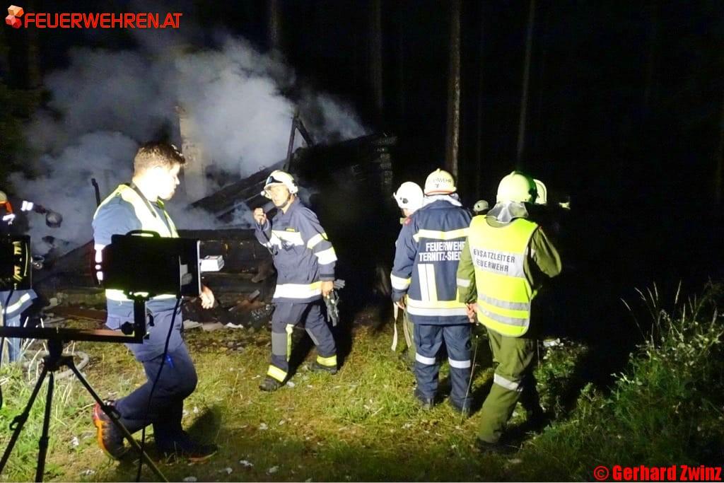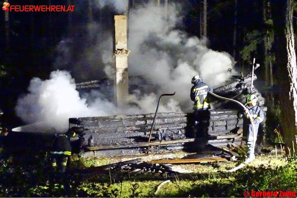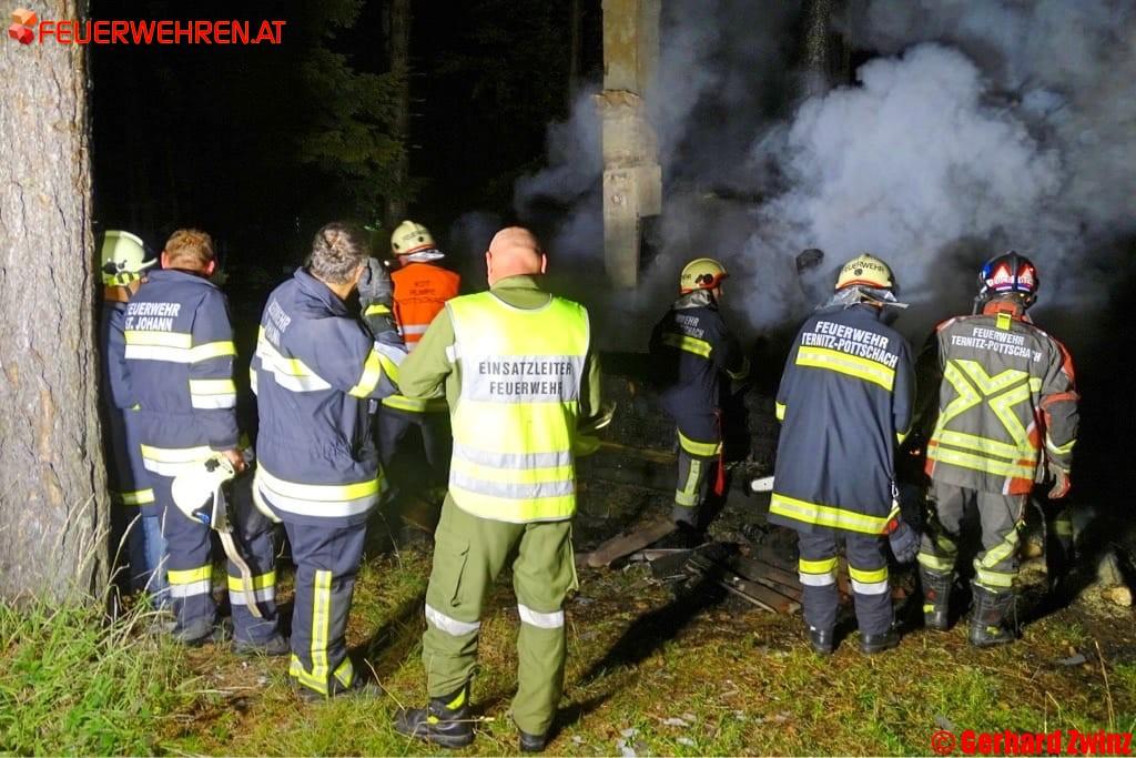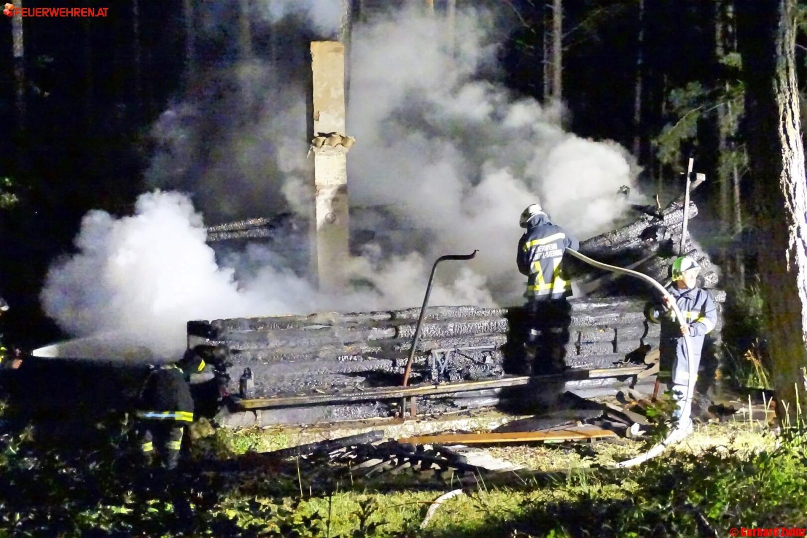 Als die ersten Feuerwehren an der Brandstelle angekommen sind, stellte sich heraus, dass es sich nicht um einen Waldbrand handelt, sondern um einen Hüttenbrand der sich in einem unwegsamen Waldgelände befunden hat.
