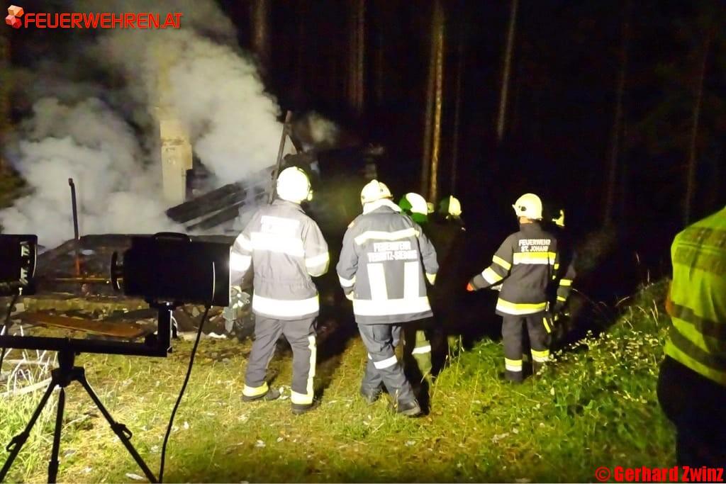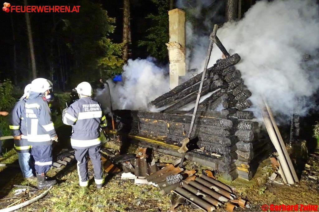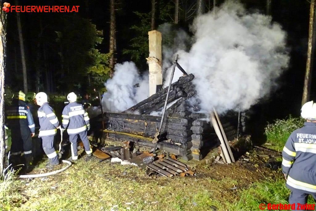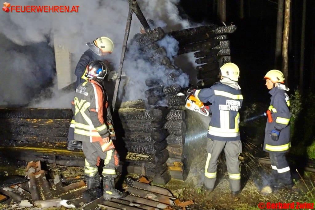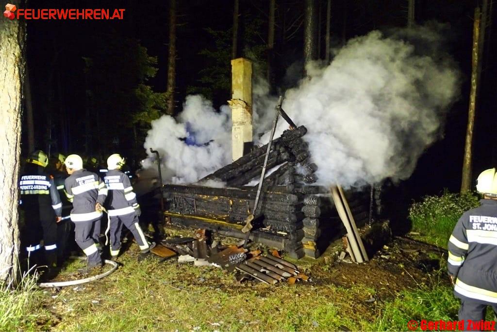 Die Jagdhütte (ca.6x3m) konnte nicht mehr gerettet werden und brannte völlig ab. Eine Ausbreitung auf das weitere Waldgebiet konnte jedoch verhindert werden.