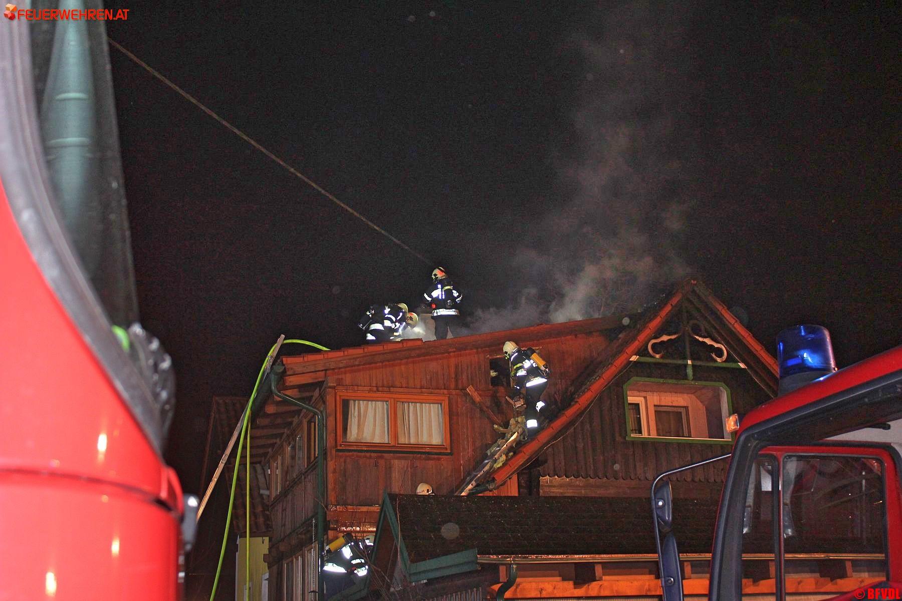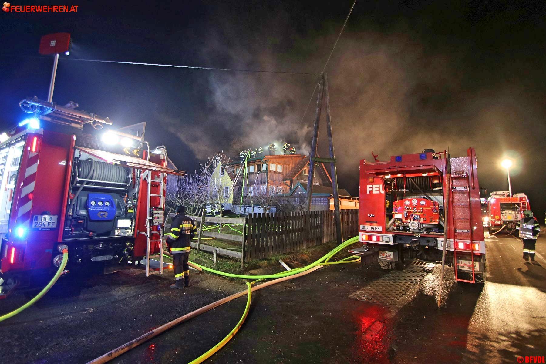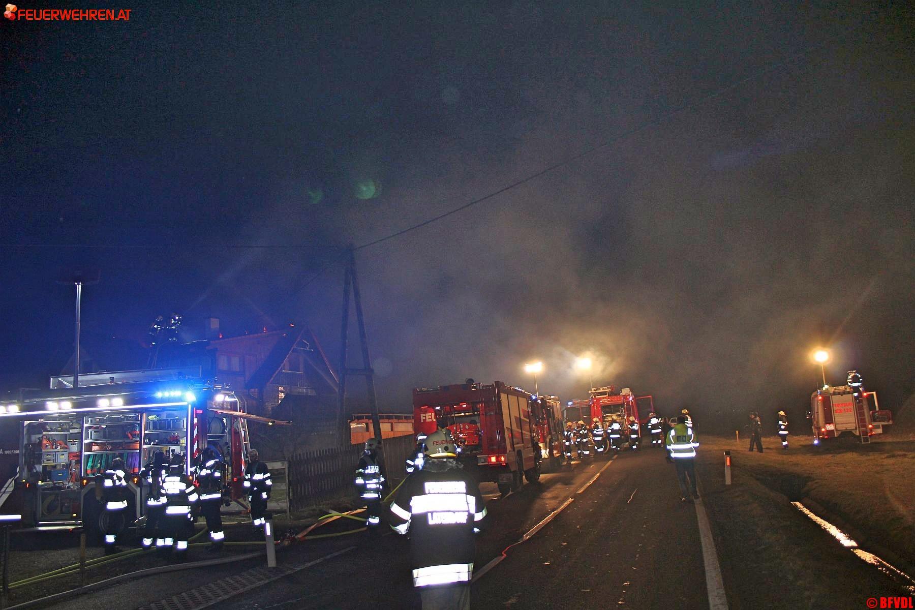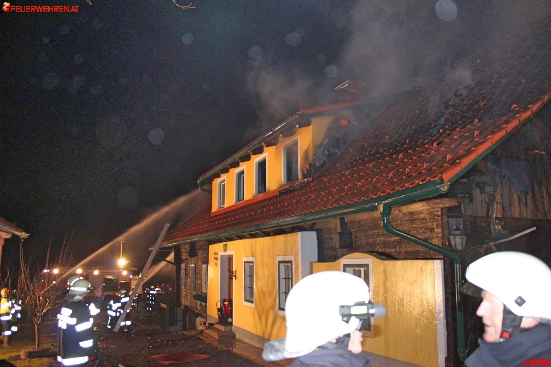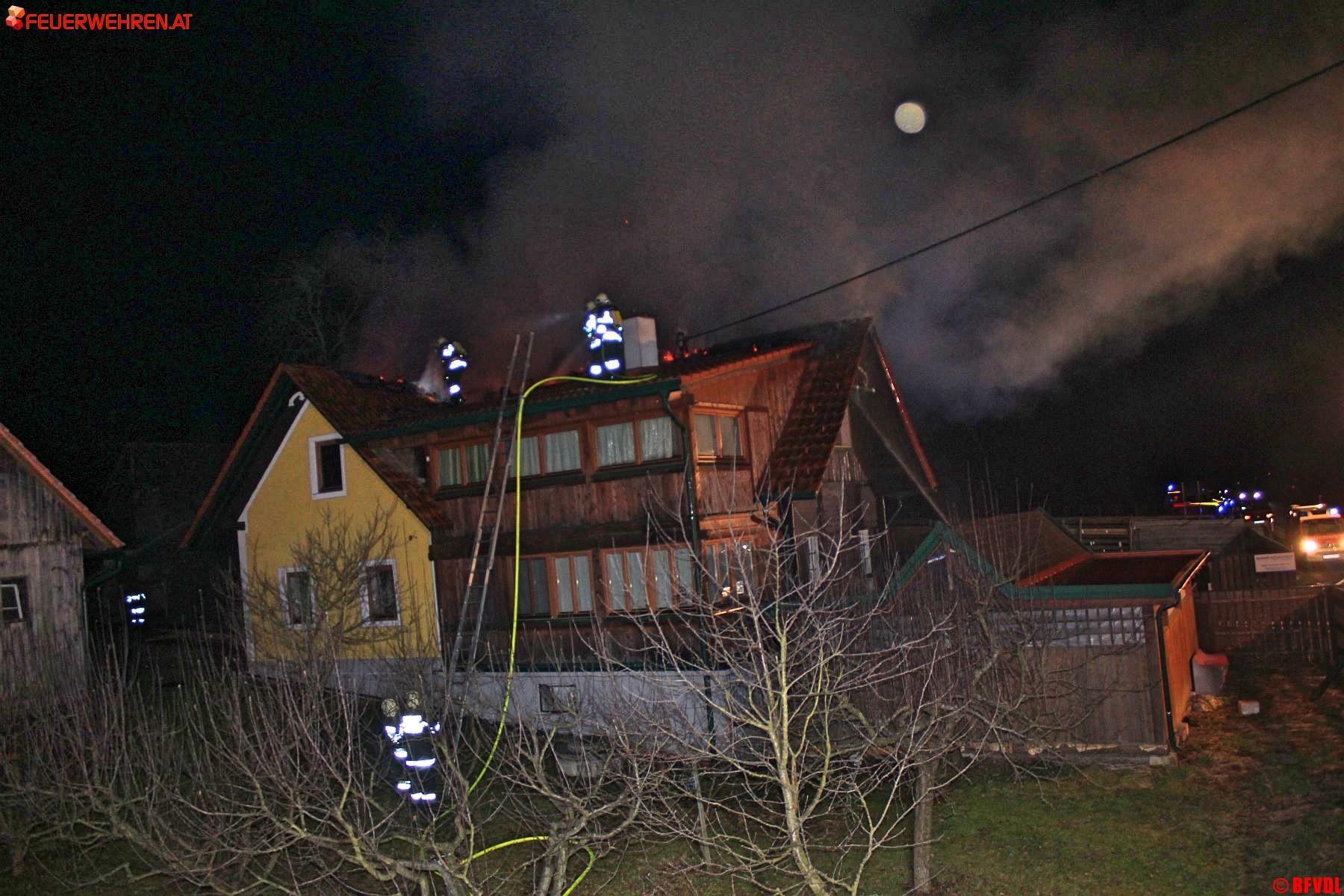 Sofort wurde ein umfassender Löschangriff auf den in Brand stehenden Dachstuhl gestartet, mehrere Atemschutztrupps bekämpften von außen und innen die Flammen. Im Laufe des Einsatzes wurden die Feuerwehren aus Oberhaag, Eibiswald, Lateindorf, St. Ulrich und Wies sowie das Atemschutzfahrzeug der Betriebsfeuerwehr Magna alarmiert, um den ausgedehnten Atemschutzeinsatz bewältigen zu können. Die Wasserversorgung wurde inzwischen über eine Zubringleitung von der nahe gelegenen Saggau hergestellt. Der zuständige Abschnittsfeuerwehrkommandant ABI Karl Koch war ebenfalls vor Ort und unterstützte die Einsatzleitung.