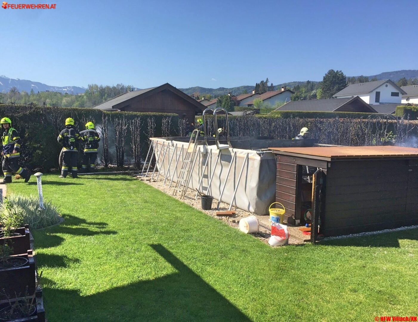 Die Gefahr bestand darin dass sich der ausgedehnte Thujenheckenbrand auf die dortigen Hütten ausbreitet, so HBI Harald Geissler Kommandant der Hauptfeuerwache Villach.