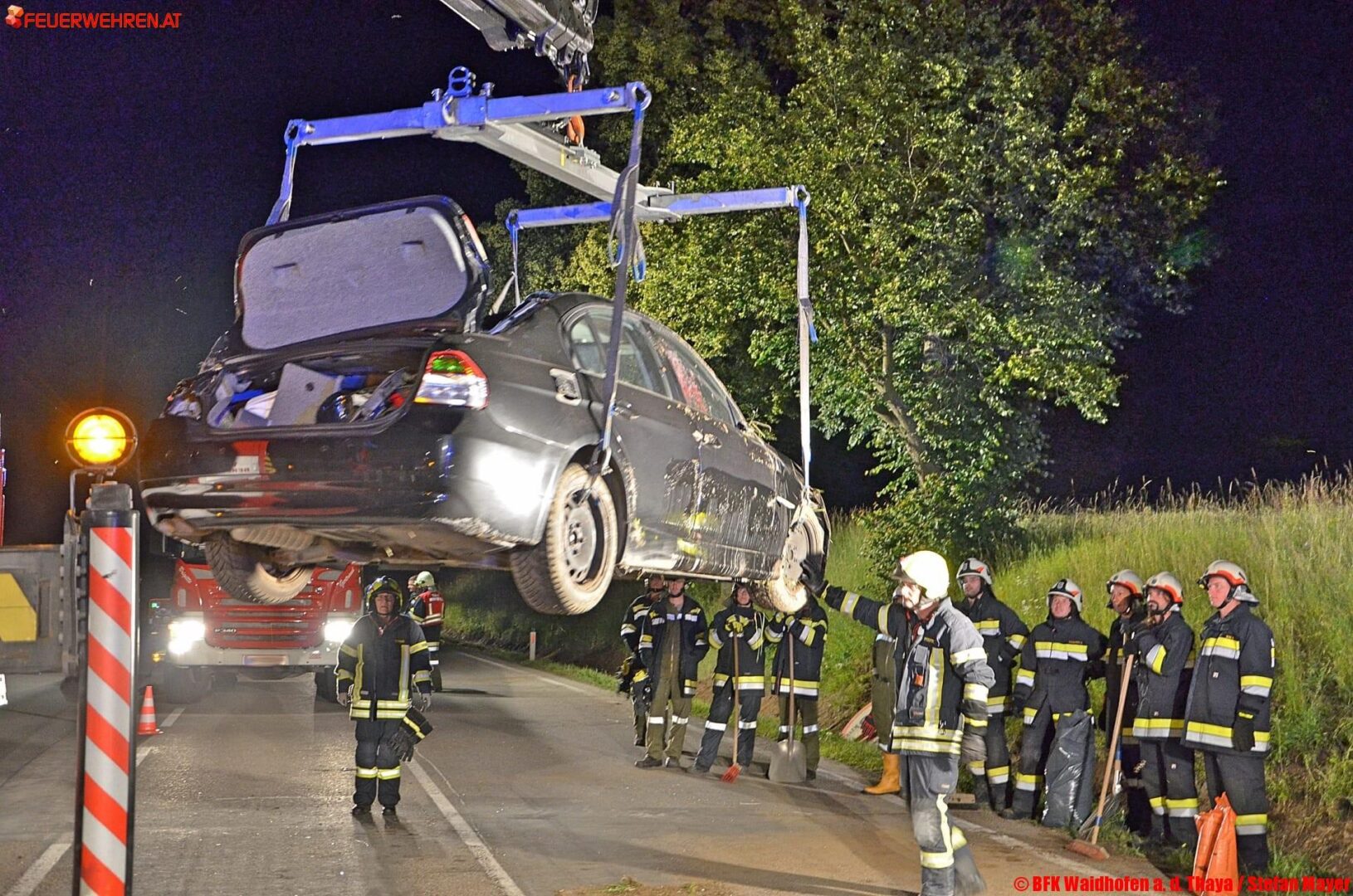 Unverzüglich wurden die Feuerwehren Vestenpoppen-Wohlfahrts, Nonndorf und Waidhofen/Thaya (FF Waidhofen/Thaya stand auch in Großeberharts im Einsatz) nachalarmiert. Bei der Ankunft der Feuerwehren war die Frau bei Bewusstsein und ansprechbar. Die Einsatzkräfte befreiten die verletzte Frau aus dem Unfallwrack und übergaben sie dem Rettungsdienst. Nach der Erstversorgung durch den Notarzt wurde die Frau ins Krankenhaus gebracht. Nachdem die Polizei die Unfallaufnahme abgeschlossen hat, wurde der schwer beschädigte PKW abtransportiert und gesichert abgestellt.