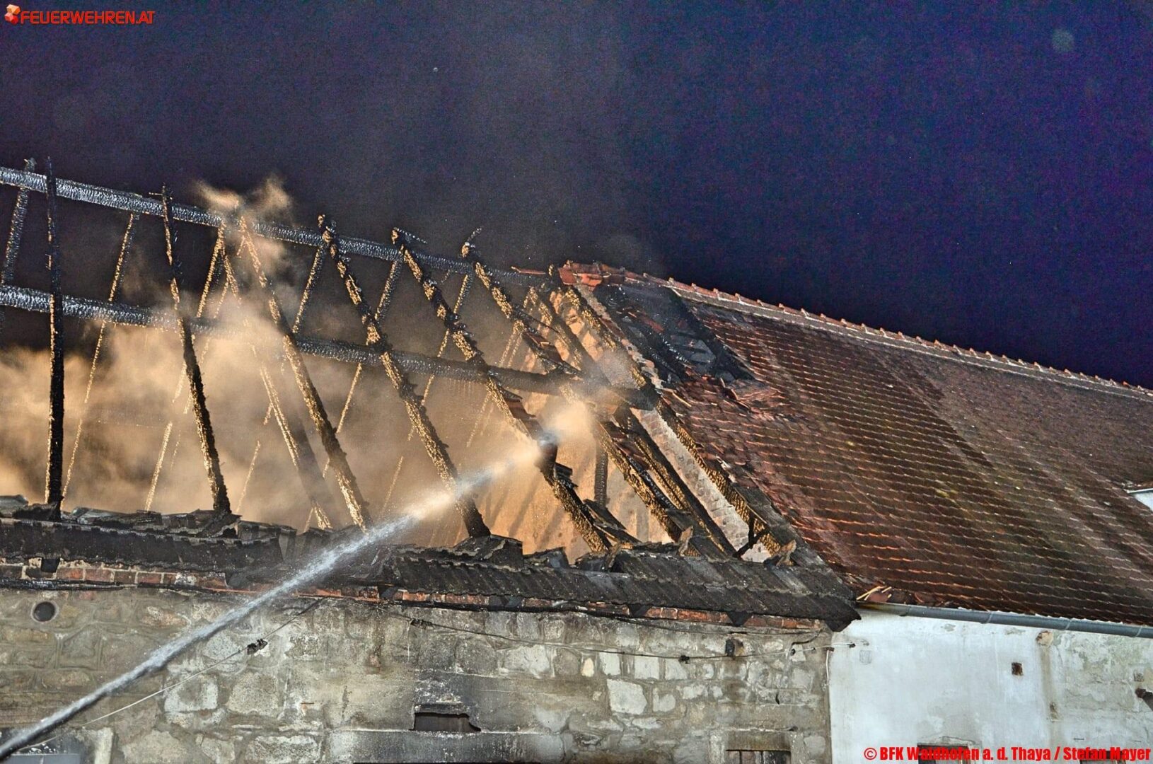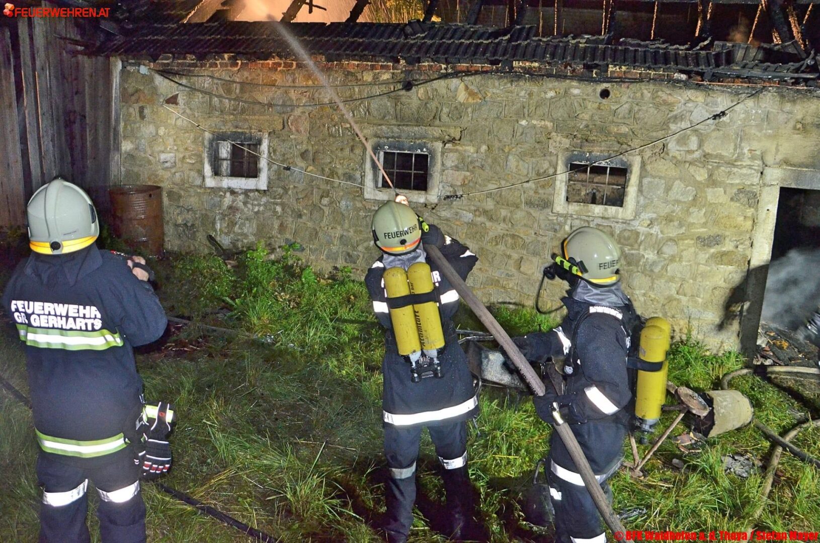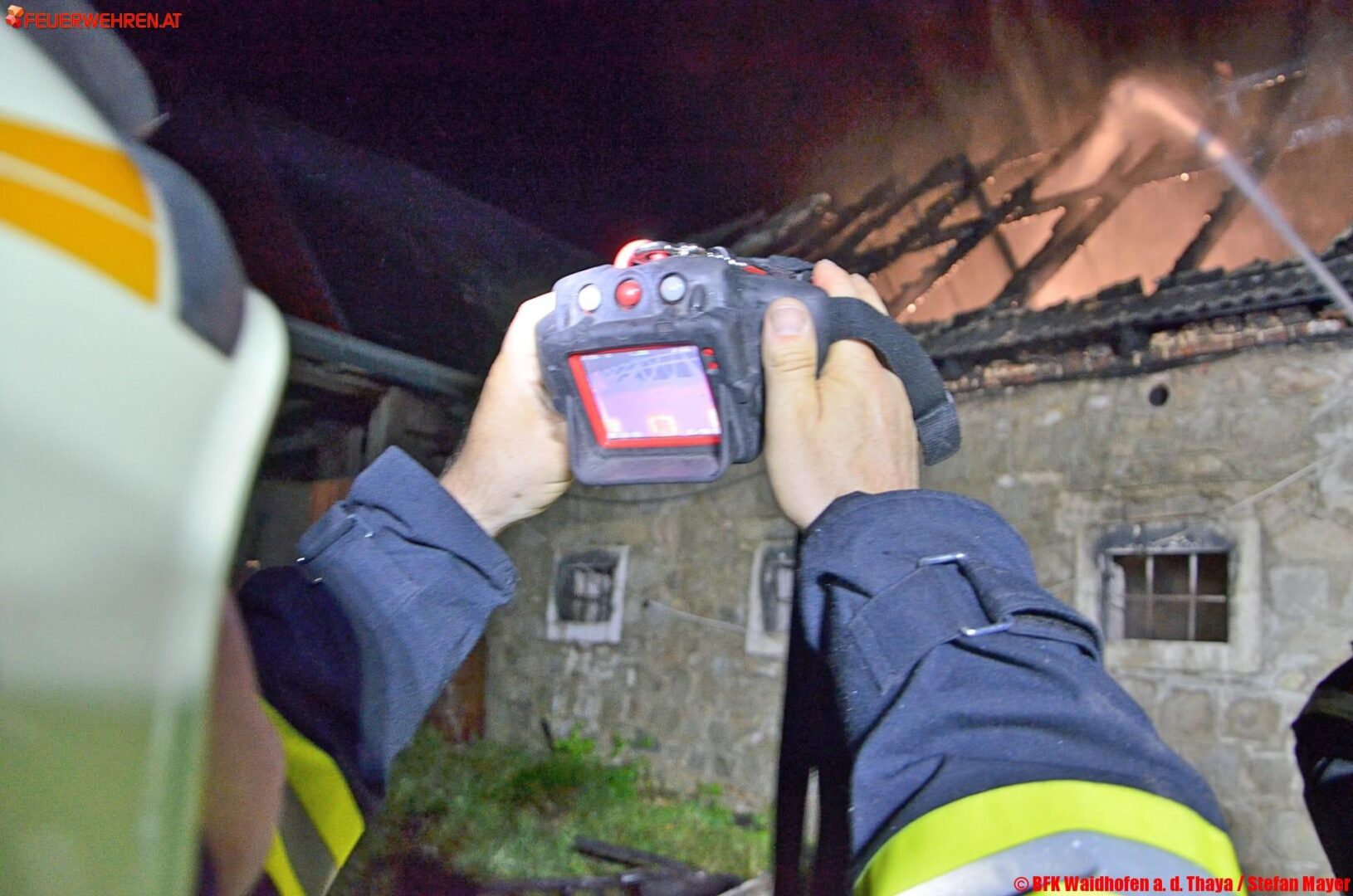 Der umfassende Löscheinsatz führte nach einiger Zeit zum Erfolg und der Brand war unter Kontrolle. Unter Einsatz von Atemschutzgeräten und einer Wärmebildkamera löschten die Feuerwehrleute die Glutnester in der Scheune ab. Um 1:30 Uhr konnte schließlich „Brand aus“ gegeben werden und die Feuerwehren rückten wieder ein. Für die Brandwache blieb die Feuerwehr Großeberharts bis Montagfrüh vor Ort. Im Einsatz standen elf Feuerwehren mit insgesamt 120 Mitgliedern, das Rote Kreuz und die Polizei.