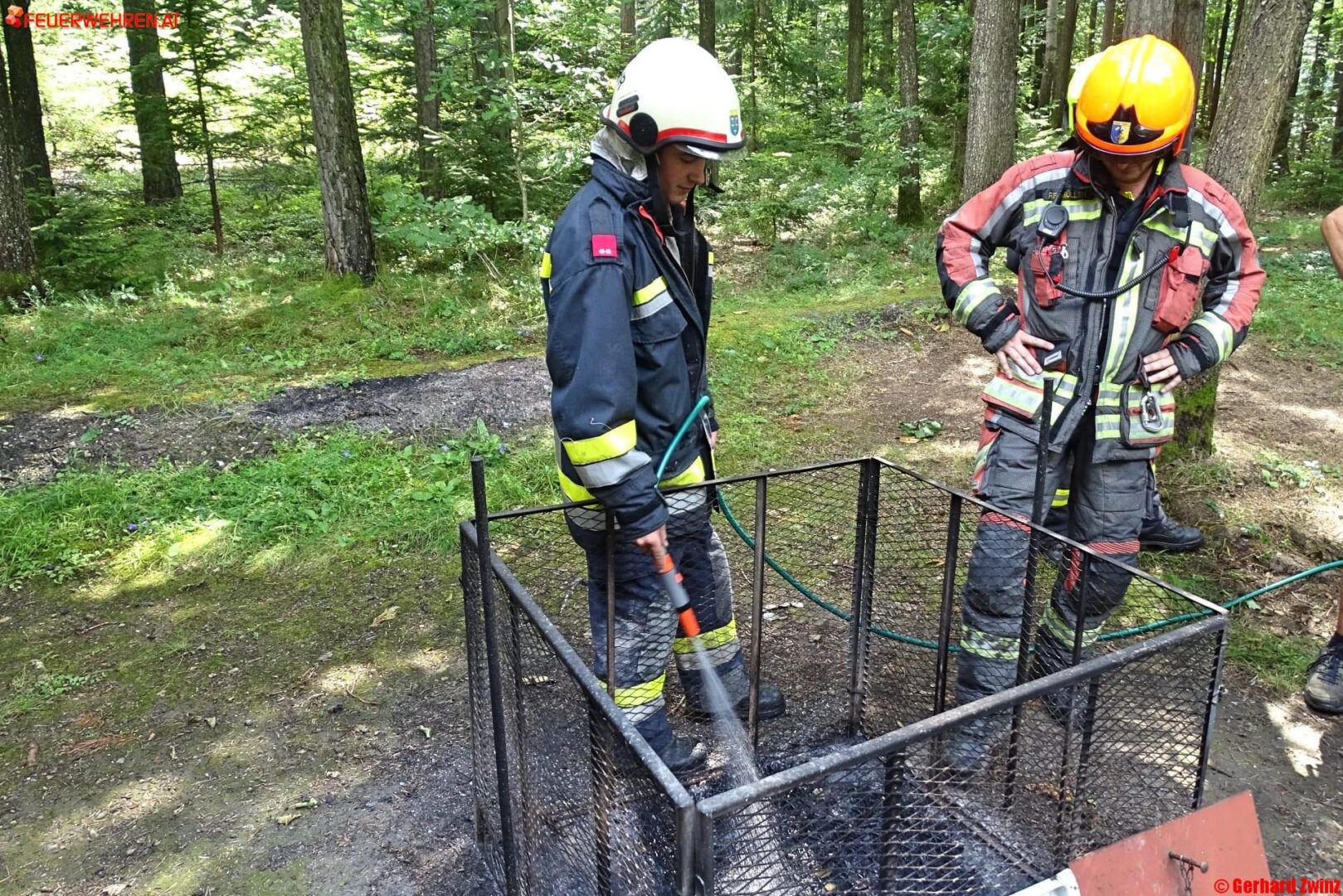 Bei einem Haus am Waldrand wurden die Florianis plötzlich fündig. Es handelte sich dabei nicht um einen Waldbrand, sondern um Abheizen in einer Gitterbox. Gemeinsam mit dem Besitzer wurde das Feuer mittels Gartenschlauch abgelöscht und die Feuerwehren konnten nach einer Stunde wieder in das Feuerwehrhaus einrücken.