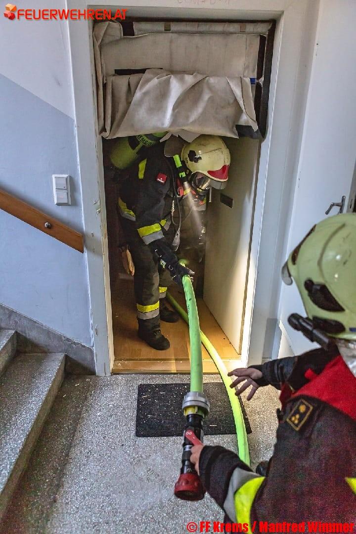 Beim Versorgen der Gerätschaften traf jedoch die nächste Alarmierung ein, diesmal wurde ein Küchenbrand in der Göttweigergasse gemeldet. Nachbarn waren durch einen ausgelösten Heimrauchmelder auf die Verrauchung aufmerksam geworden. Erneut rückte die Hauptwache aus, die ersteingetroffenen Feuerwehrkräfte bauten eine Löschleitung auf und setzten einen Rauchverschluss. Parallel dazu verschaffte sich ein Atemschutztrupp über die Drehleiter Zugang zu der versperrten Wohnung, sodass in diesem Fall auf ein Aufbrechen der Wohnungstür verzichtet werden konnte. Ebenso wie beim vorangegangenen Einsatz wurde als Verursachung der Rauchentwicklung angebranntes Essen ausfindig gemacht, auch in diesem Fall befand sich niemand in dem betroffenen Objekt. Auch hier wurde das Kochgeschirr ins Freie gebracht und der Rauch aus der Wohnung abgeführt.