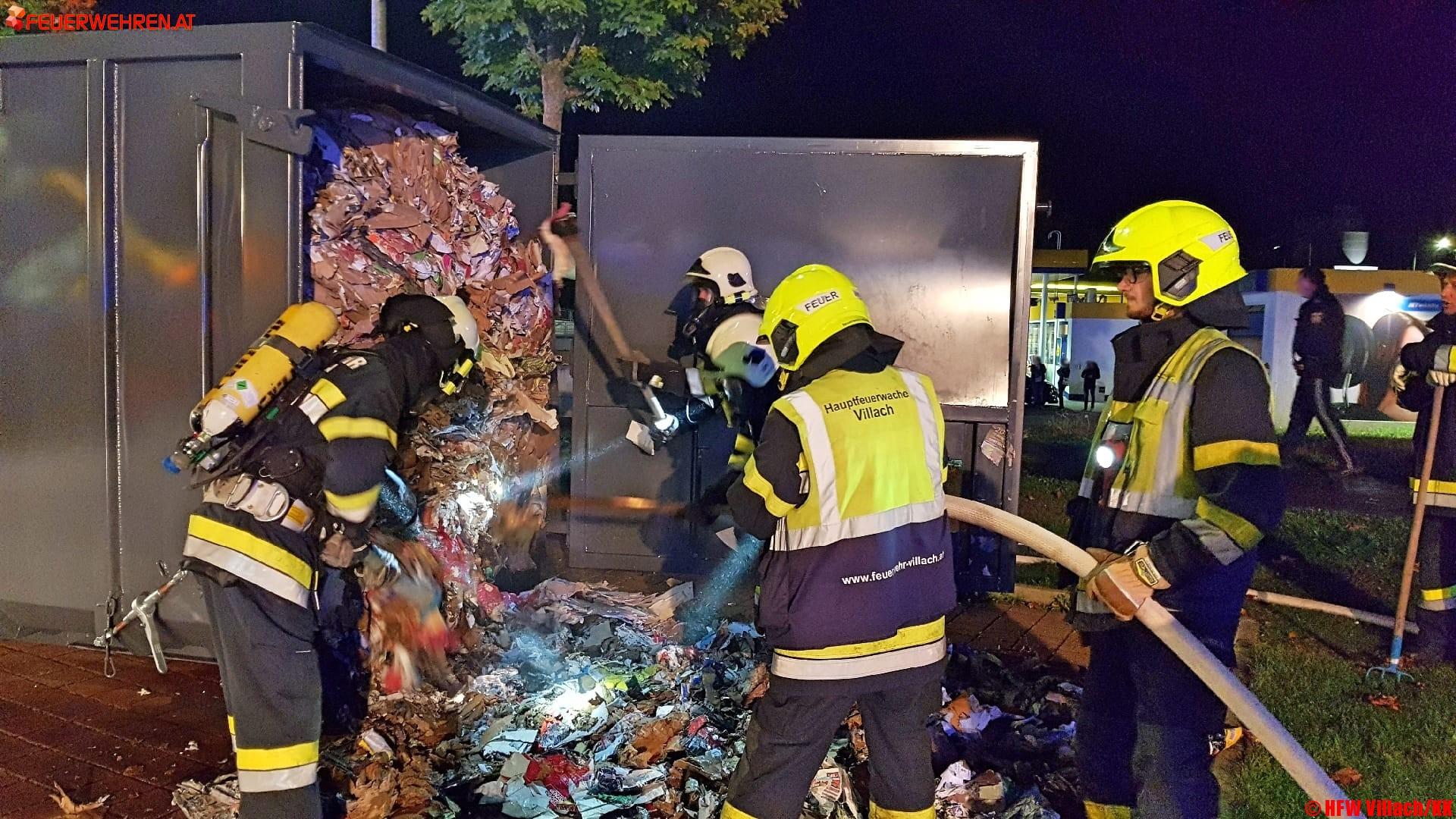 Im Bereich einer Kartonpresse, welche an einem Lagercontainer angebracht war, kam es aus noch unbekannter Ursache zu einem Brand, welcher sich auf die zerkleinerten Kartonagen im Inneren des Containers ausbreitete.