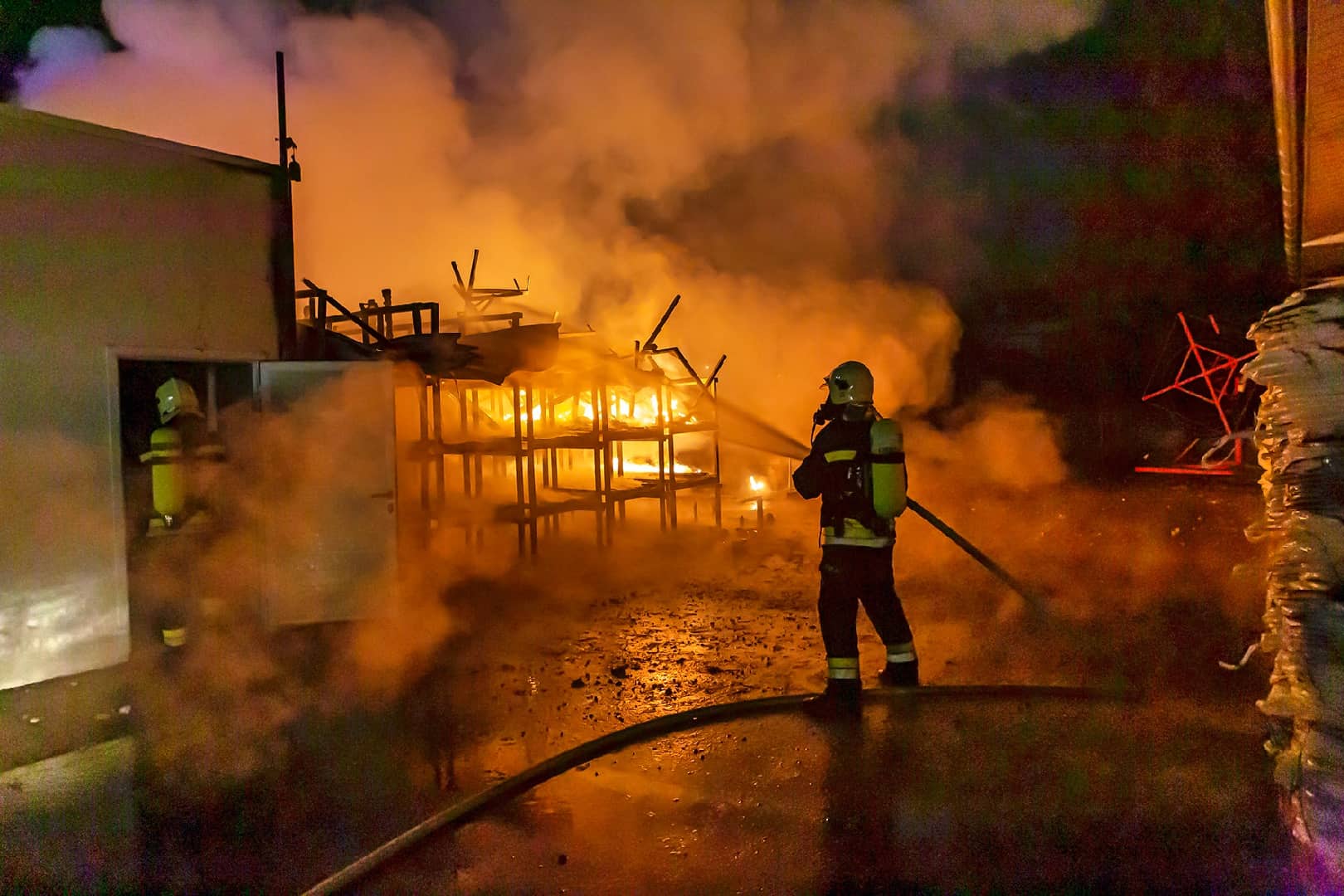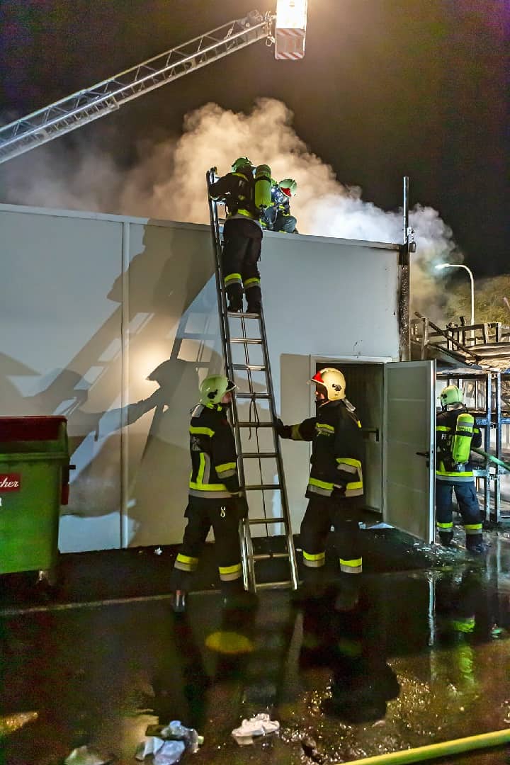 Da es sich bei dem Brandgut um mehrere Paletten Kunststoffrohre handelte, welche aufgrund der enormen Hitze stark verschmolzen waren, gestalteten sich die Nachlöscharbeiten schwierig. Mit dem Einsatz von mehreren Wärmebildkameras konnten versteckte Glutnester rasch aufgespürt werden. Die eingesetzten Atemschutztrupps löschten alle gefundenen Glutnester gezielt ab.