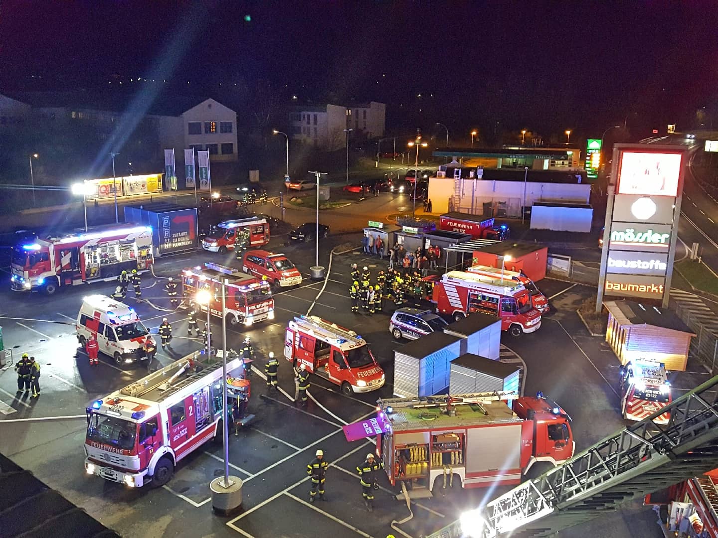 Sofort wurde über die Drehleiter ein Löschangriff unter schweren Atemschutz vorgenommen, zeitgleich unternahm bereits am Dach ein Mitarbeiter erste Löschversuche mit einem tragbaren Feuerlöscher. Die Geschäftsleitung löste darauf den Räumungsalarm für die gesamte Betriebsanlage aus. Mitarbeiter und Kunden verließen darauf hin unverzüglich den Baumarkt.