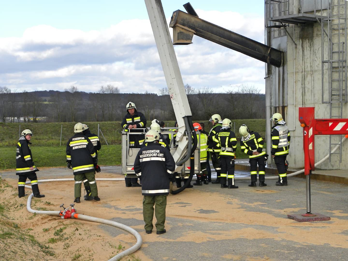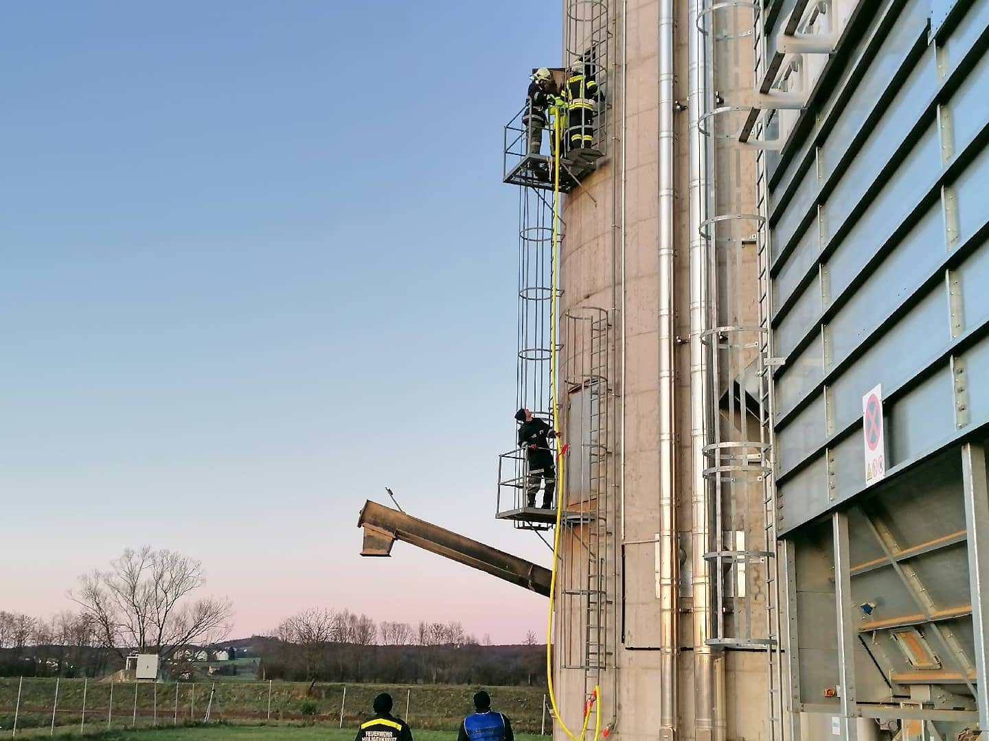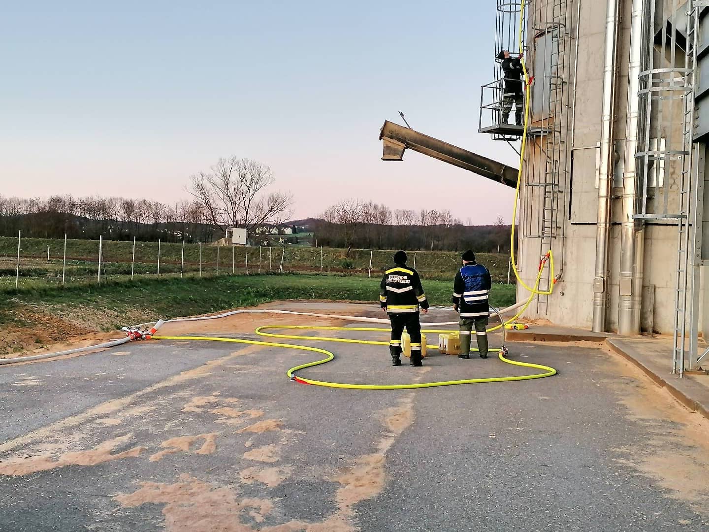 Zu Mittag kam es in einem Industriebetrieb im Wirtschaftspark in Heiligenkreuz zu einem Silobrand. Die alarmierte Feuerwehr flutete den Silo mit Wasser. Danach wurde unter Atemschutz der Silo geöffnet. Die Firmenleitung versuchte mit Absprache der Feuerwehr eine Firma zu finden, die das Silo-Gut (Sägespäne) aussaugt.