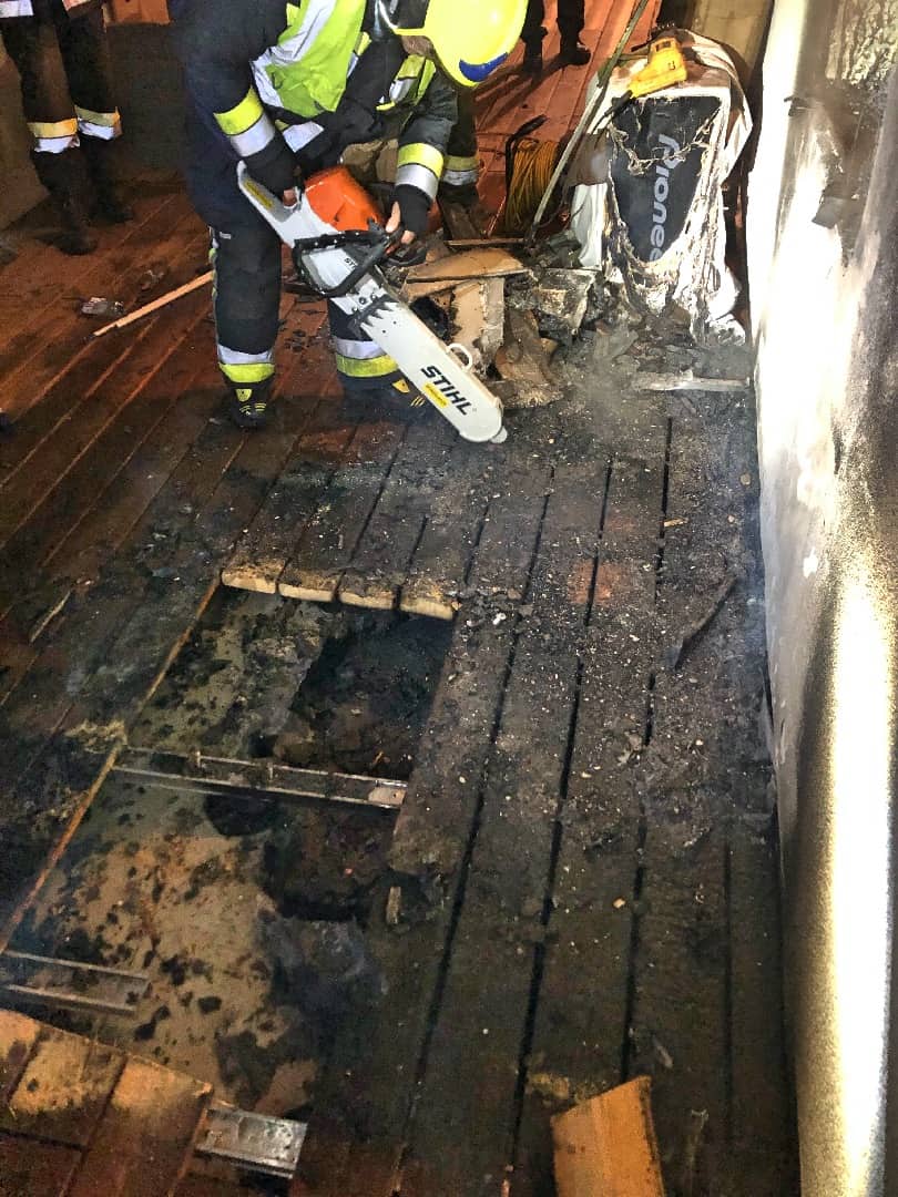 Mit Säbel- und Rettungssäge wurden die Bretter um die Brandausbruchstelle großflächig geöffnet, da die brennenden Tropfen der verbrannten Rattanmöbel auch die Styropordämmung unterhalb des Bodens entzündet hatten. Die sichtbaren Flammen unterhalb des Bretterbodens konnten durch den Angriffstrupp gelöscht und so ein weiteres Ausbreiten verhindert werden. Großes Glück hatten die Hausbewohner, dass durch die enorme Hitzeentwicklung vor dem Küchenfenster nur die äußere Glasscheibe geborsten war und so kein Flammenüberschlag in das Innere des Gebäudes erfolgte. Nach der Kontrolle und Entfernung der Wärmeverbunddämmung an der Hausmauer und im Bereich des Rollladenkastens konnte die Brandstelle vom Einsatzleiter der Feuerwehr Vassach wieder freigegeben werden.