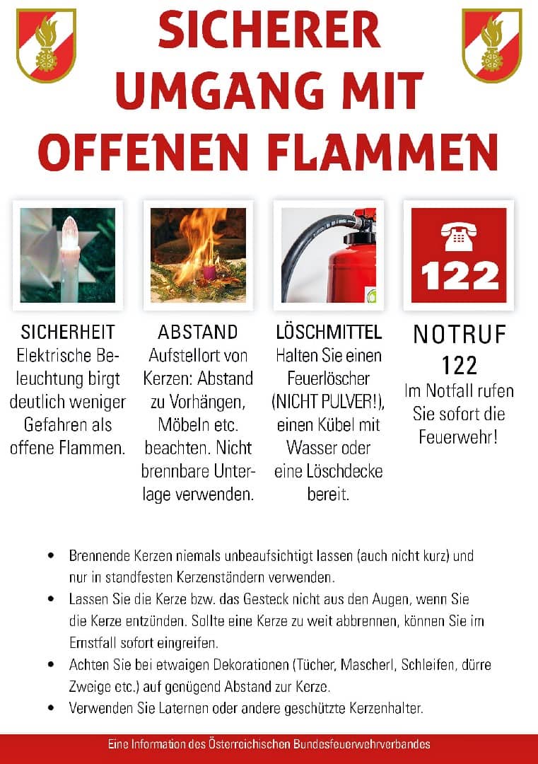 „Die Erfahrungen zeigen uns, dass vielen Menschen die Gefahren im Eigenheim nicht bewusst sind. Die Feuerwehren ersuchen dringend, achtsam zu sein und beispielsweise Kerzen nicht unbeaufsichtigt zu lassen“, erklärt Albert Kern, Präsident des Österreichischen Bundesfeuerwehrverbandes. Zur Aufklärung über verschiedene Gefahren hat der Österreichische Bundesfeuerwehrverband einige Informationen aufbereitet und zur Verfügung gestellt: