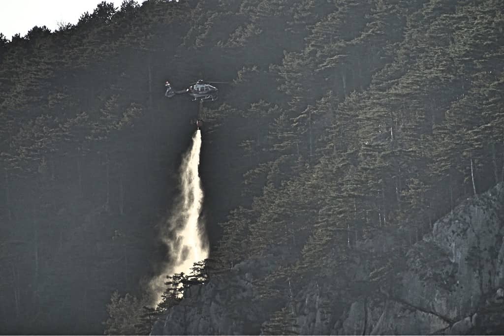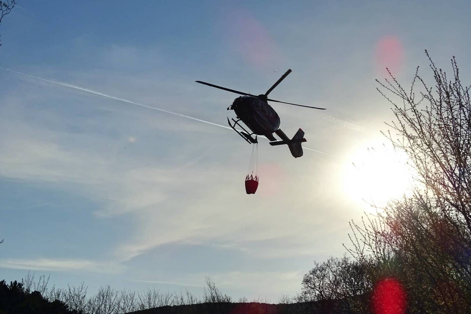 Mittels Hubschrauber der Polizei wurde Wasser über der steilen Felswand abgeworfen. Gegen 18:40 Uhr konnte der Einsatz mit dem Hubschrauber beendet werden. Die Feuerwehren stehen natürlich noch weiter im Einsatz.