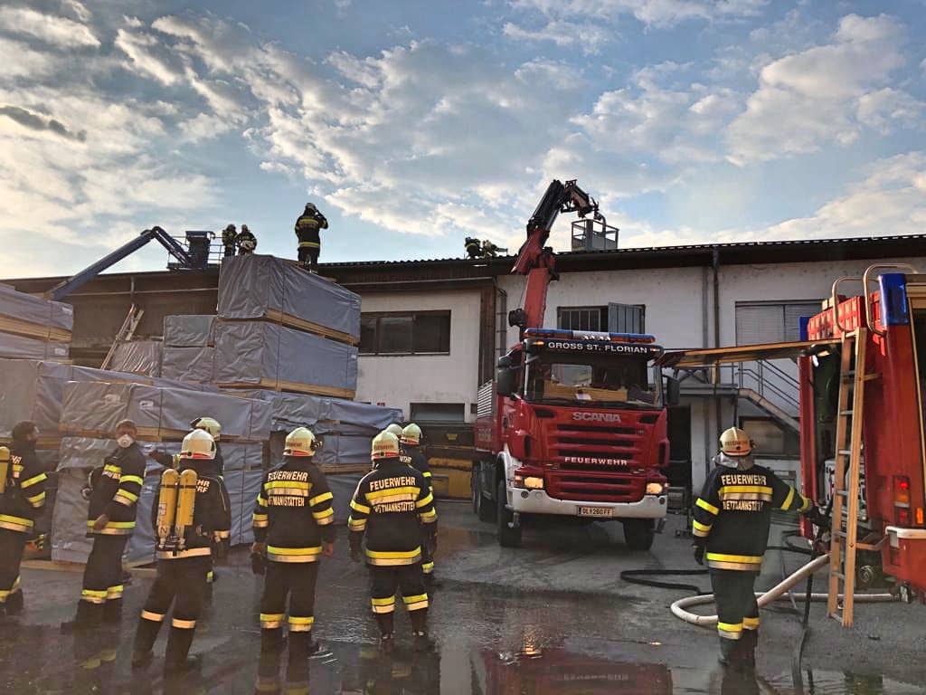 Der Einsatzleiter ordnete sofort einen Innen- sowie einen Außenangriff an. Mittels mehrerer Hochdruckrohre und Atemschutztrupps konnte der Brand relativ rasch unter Kontrolle gebracht werden. Nach einer Einsatzzeit von etwa einer Stunde konnte HBI Sundl „Brand aus“ verkünden. In Folge wurde mit den Nachlöscharbeiten begonnen. Damit das Blechdach gesichert geöffnet werden konnte, wurde die Feuerwehr Groß Sankt Florian mit ihrem Kranfahrzeug nachalarmiert.