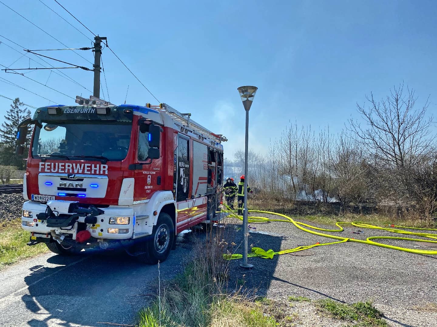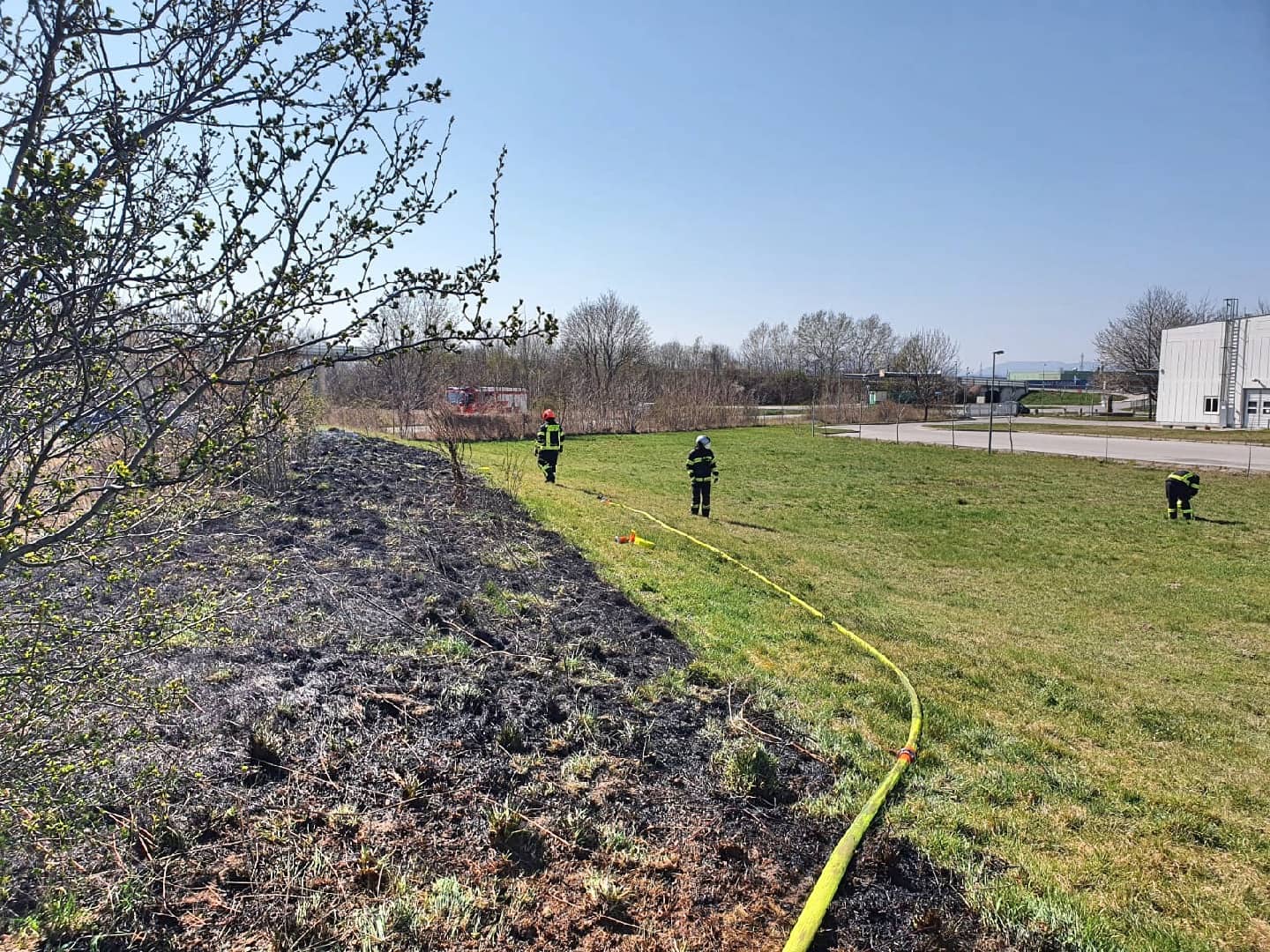 Donnerstagmittag brach im Industriegebiet Ebenfurth aus unbekannter Ursache ein Flurbrand aus. Knapp 300 Quadratmeter Böschung standen beim Eintreffen der Einsatzkräfte in Brand.