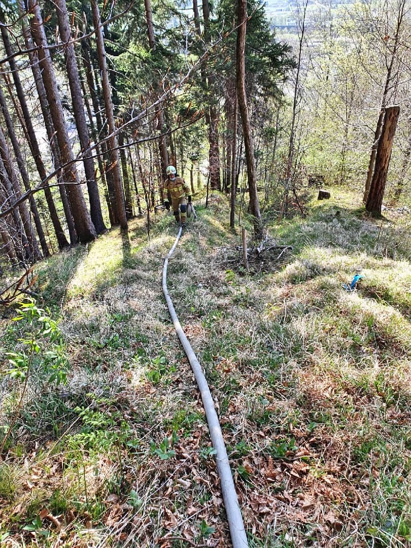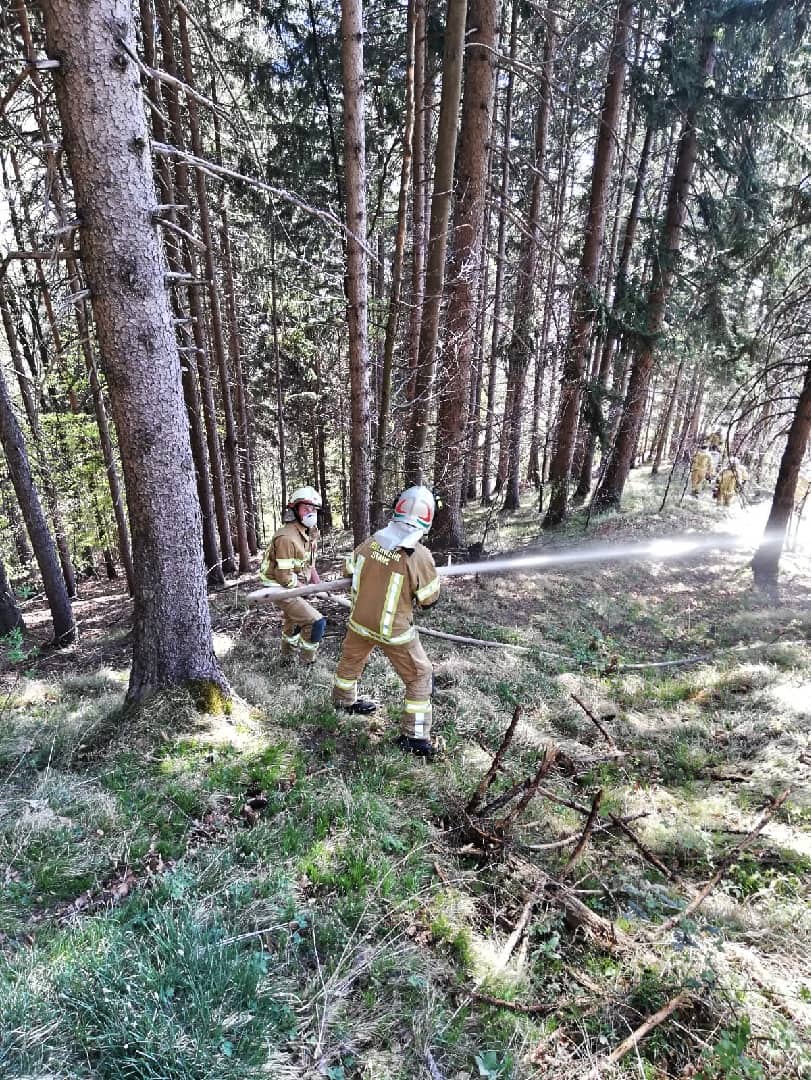 Sobald die mehrere hundert Meter lange Löschleitung fertig war, konnte mit den Nachlöscharbeiten begonnen werden. Sämtliche Geräte wie Schläuche, Schanzwerkzeug, usw. mussten dafür von der Mannschaft zu Fuß durch das steile Gelände zum Ereignisort gebracht werden, die warmen Temperaturen erschwerten die Arbeit zusätzlich. Nach gut einer Stunde konnte bereits „Brand aus“ gegeben werden. Weitere eineinhalb Stunden nahm dann noch das Aufräumen in Anspruch, wobei ein Teil der Löschleitung vor Ort blieb, um bei einem etwaigen erneuten Aufflammen schneller eingreifen zu können.