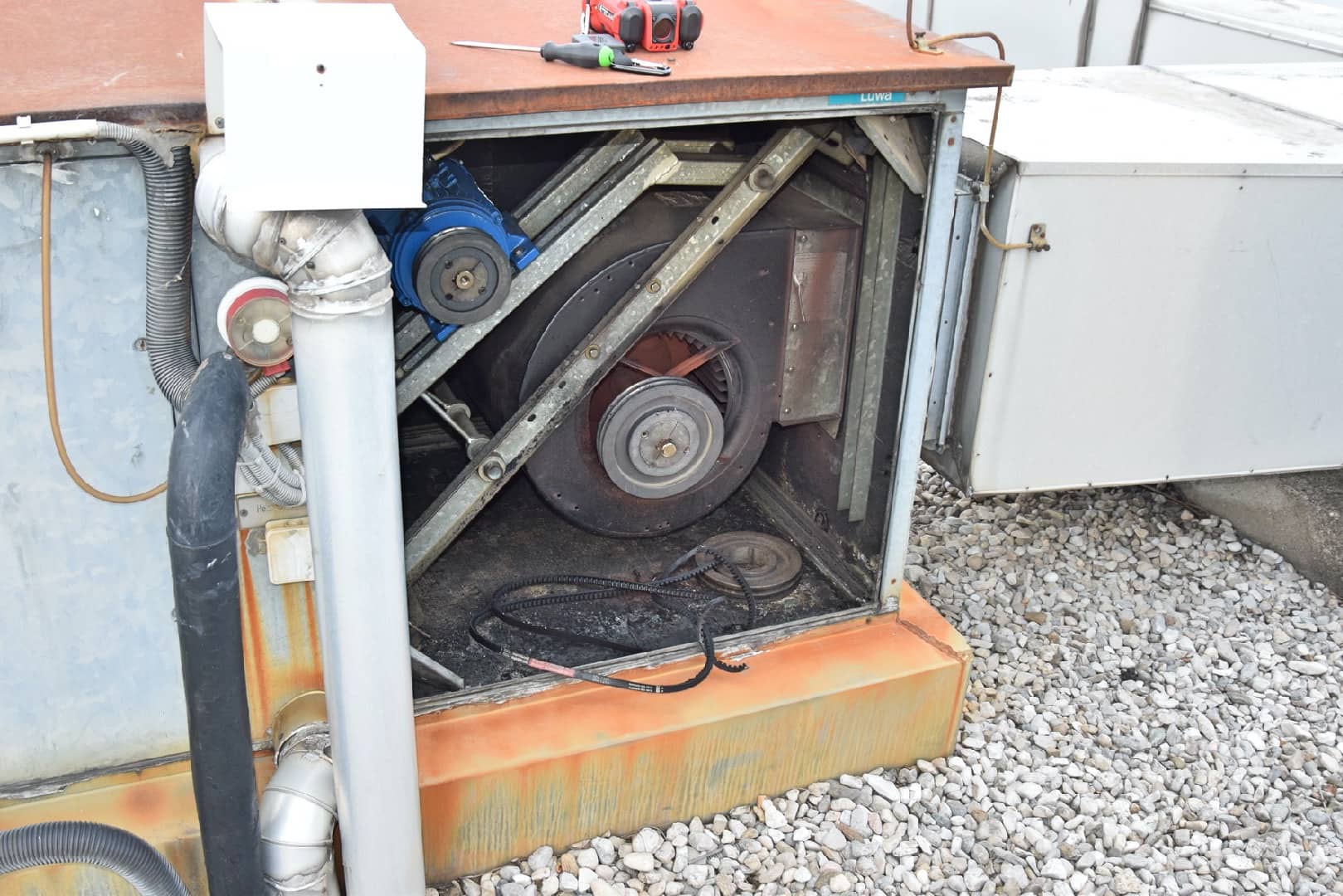 Auch wurden durch einen zweiten Atemschutztrupp sämtliche Revisionsklappen in den Zwischendecken kontrolliert – ebenfalls ohne Erfolg. Erst die Auswertung der Lüftungszentrale des Objektes schaffte Klarheit: ein defekter Motor in der Lüftungsanlage am Dach des Freizeitzentrums sorgte für die Rauchentwicklung im Gebäude. Der betroffene Motor wurde nach Aufstieg über die Drehleiter durch die Feuerwehr abgeschlossen.