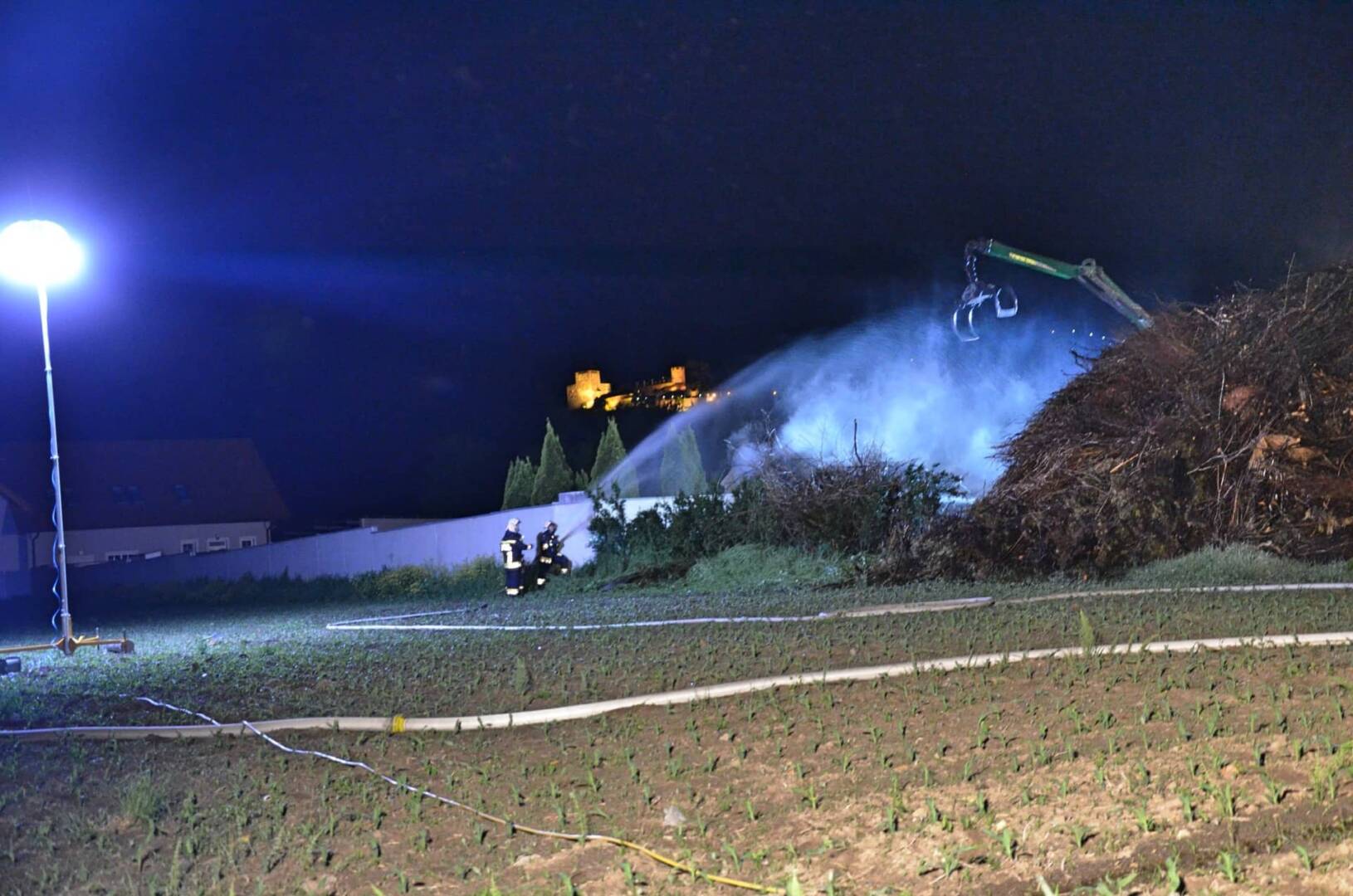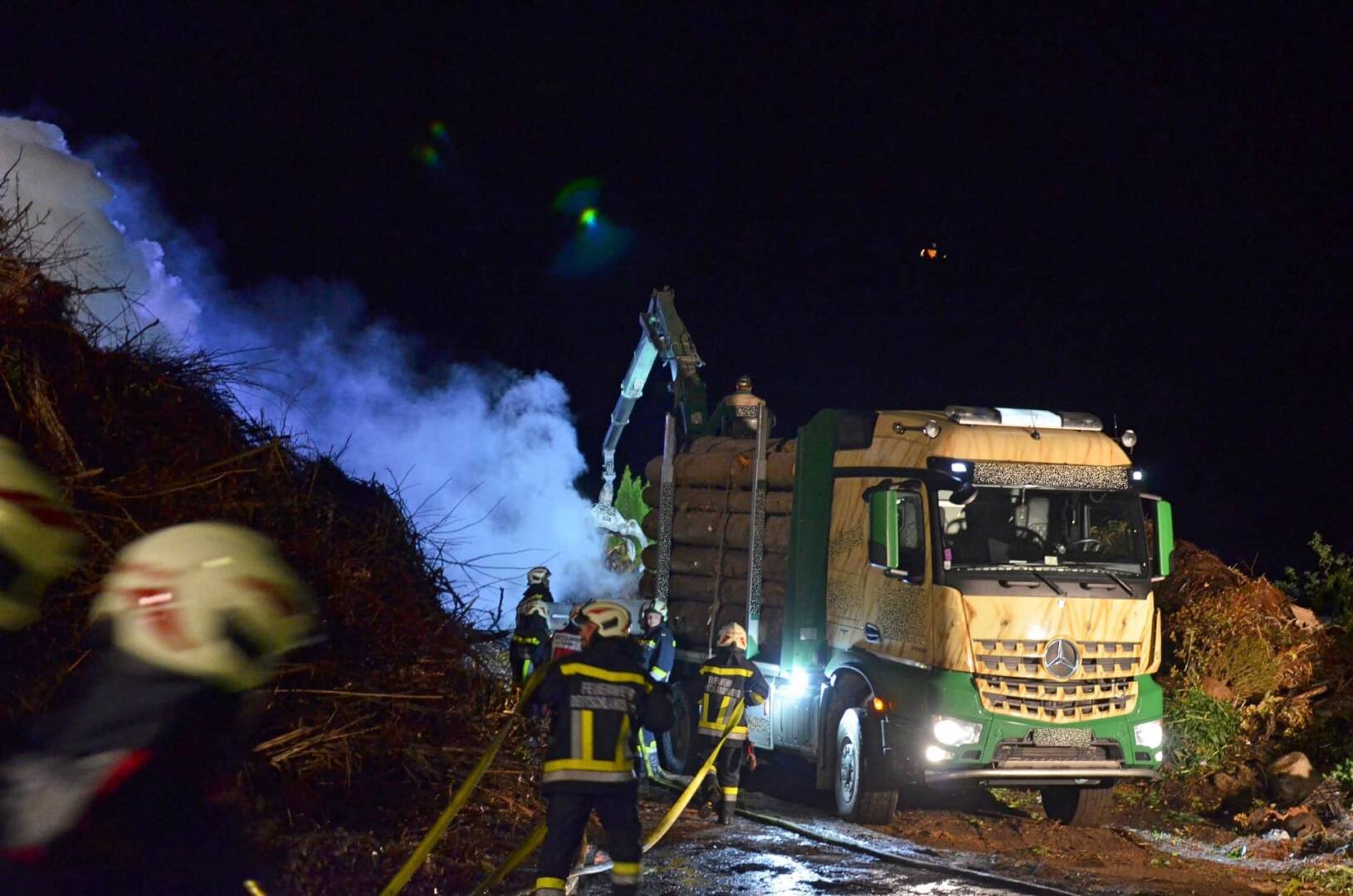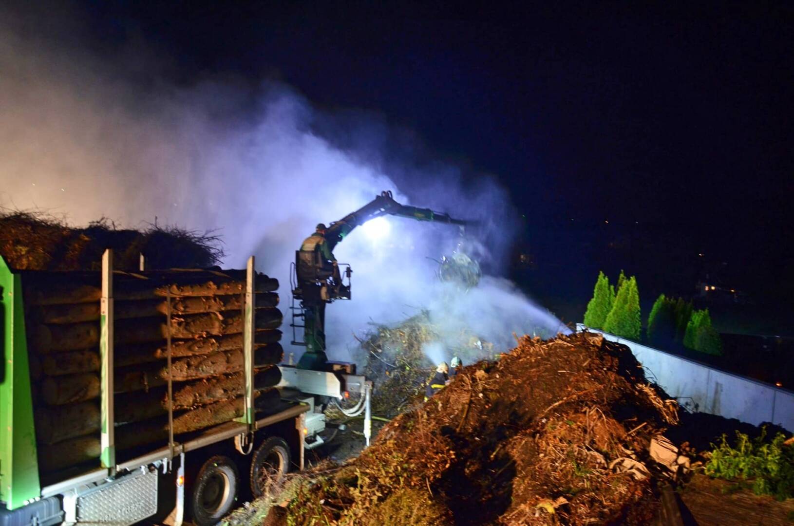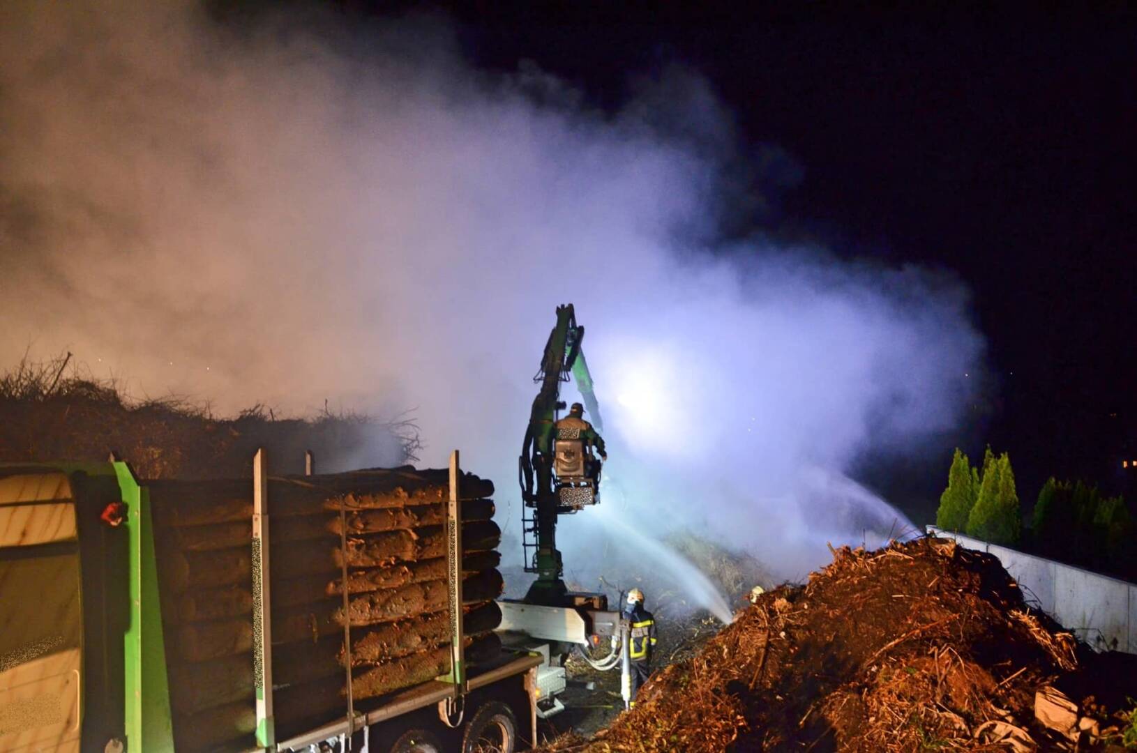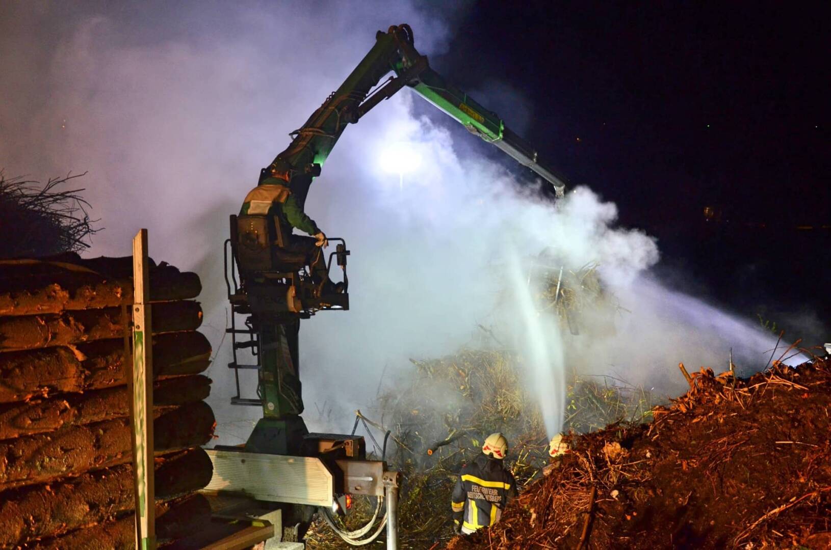 Seitens der Einsatzleitung wurde ein Holzkranwagen der Firma Liechtenstein Fdion. alarmiert, um die Einsatzkräfte bei den Löscharbeiten zu unterstützen. Ebenso wurde durch den Eigentümer mit einem Lader die Zufahrt für den LKW freigemacht. Mit dem Kran des LKW´s wurde der noch stark rauchende Haufen abgetragen und abgelöscht. Diese Maßnahme zeigte schnell Wirkung und der Brand konnte rasch unter Kontrolle gebracht werden.