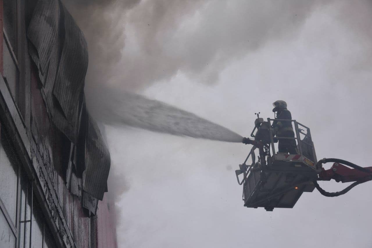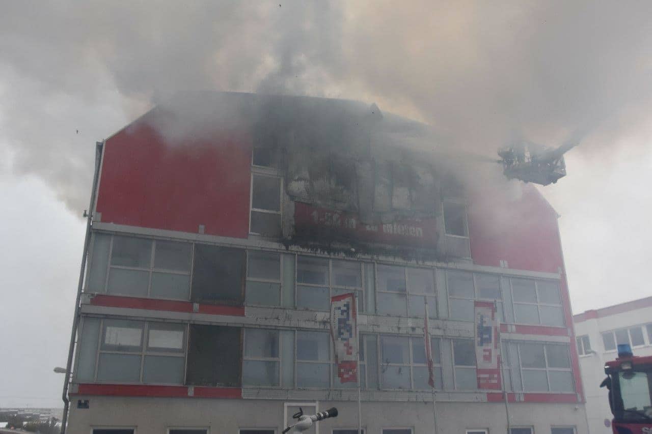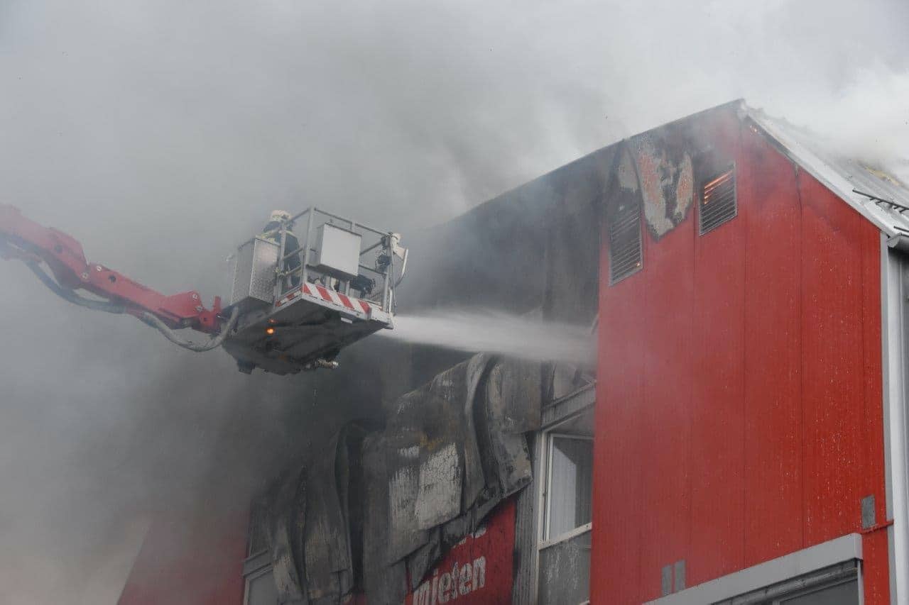 Bei der Ankunft der ersten Feuerwehrkräfte wurde ein voll entwickelter Brand festgestellt und sofort mit der Brandbekämpfung begonnen. Aufgrund umfassender Löschmaßnahmen löste die Feuerwehr „Alarmstufe 2“ aus. Aktuell treten insbesondere im Dachbereich immer wieder Flammen aus. Unter Atemschutz bekämpfen die Feuerwehrleute den Brand und sind neben der Hitze auch mit der starken Rauchentwicklung konfrontiert. Mit speziellen Trennsägen öffnen Feuerwehrtrupps über die eingesetzten Teleskopmastbühnen und Drehleitern die Dachkonstruktion.