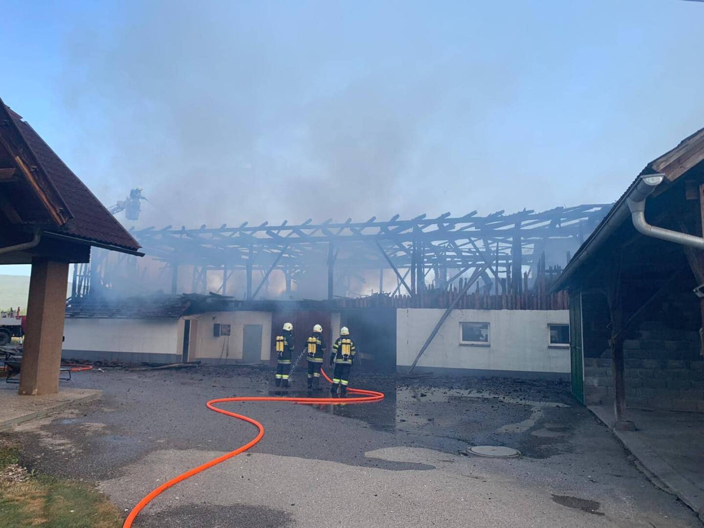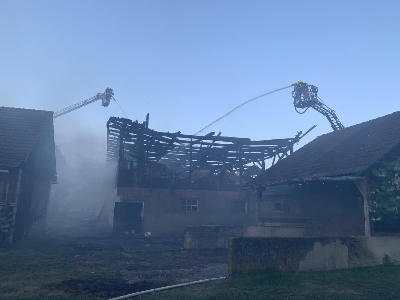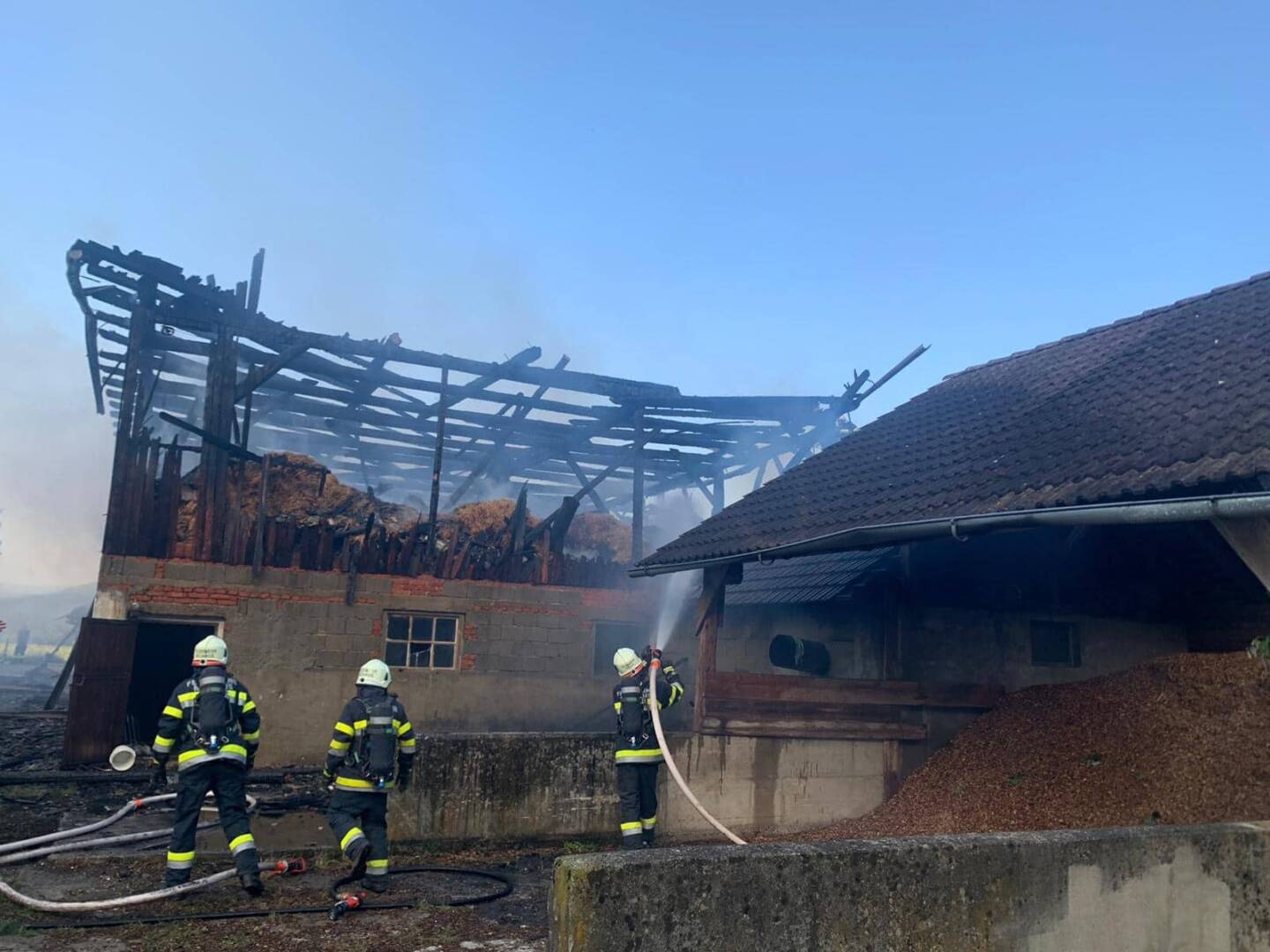 Weitere fünf Feuerwehren wurden nachalarmiert und ein Pendelverkehr eingerichtet. Glücklicherweise befanden sich keine Tiere im Gebäude und es gab auch keine Verletzten. Das Futtermaterial konnte mit einem Holzkran im Inneren des Gebäudes ausgebracht werden und die darin befindlichen Glutnester gelöscht werden. Bezirksfeuerwehrkommandant Patrick Skubel unterstützte ebenso die Führungsunterstützung vor Ort bei der Schadenslage.