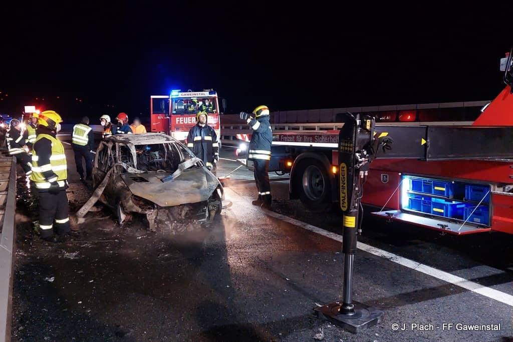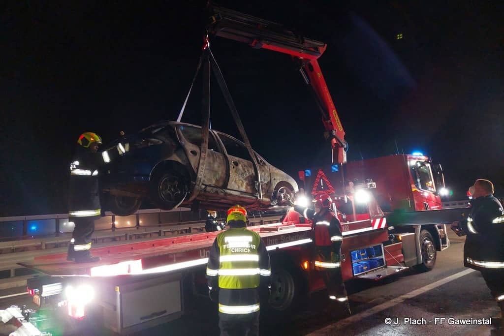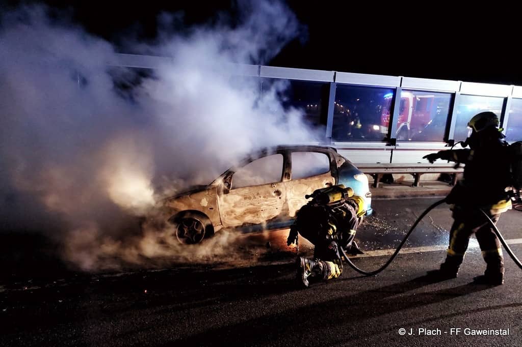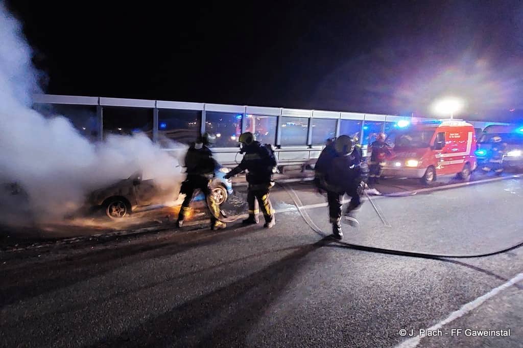 Beim Eintreffen am Einsatzort stand der Pkw am Pannenstreifen in Vollbrand. Nachdem die ersten Löschfahrzeuge eintrafen, wurde sofort mit den Löscharbeiten begonnen. Nach kurzer Zeit war der Brand unter Kontrolle und es konnte kurze Zeit später Brand aus gegeben werden.