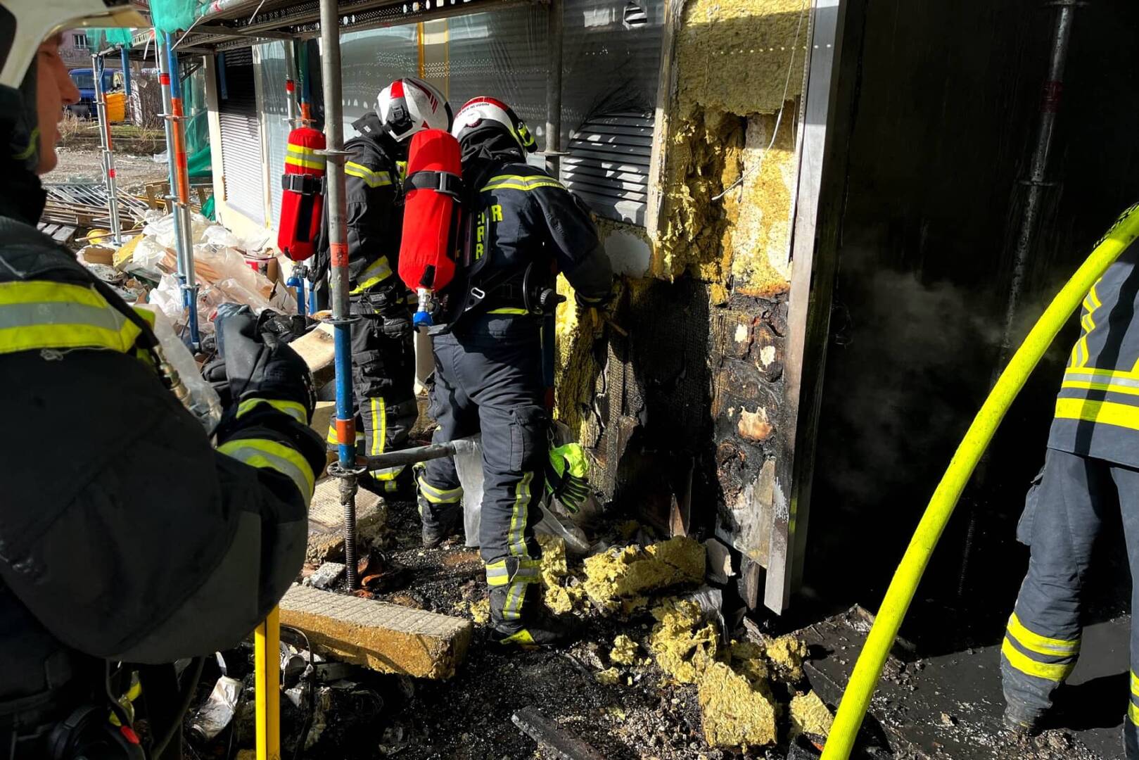 Nachdem das Feuer rasch gelöscht werden konnte, wurde die Fassade händisch geöffnet und Nachlöscharbeiten auch aus dem Korb der Drehleiter durchgeführt.