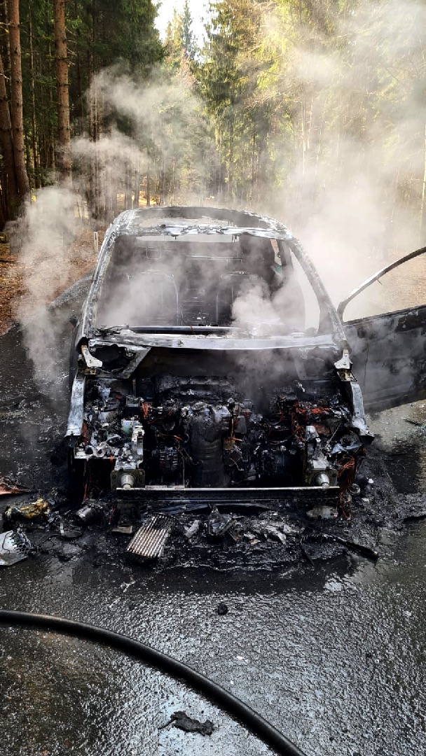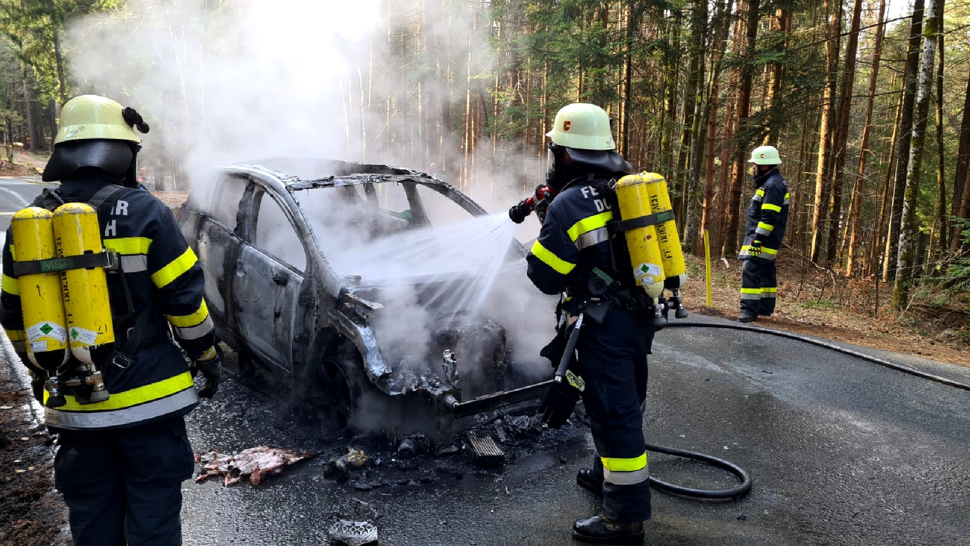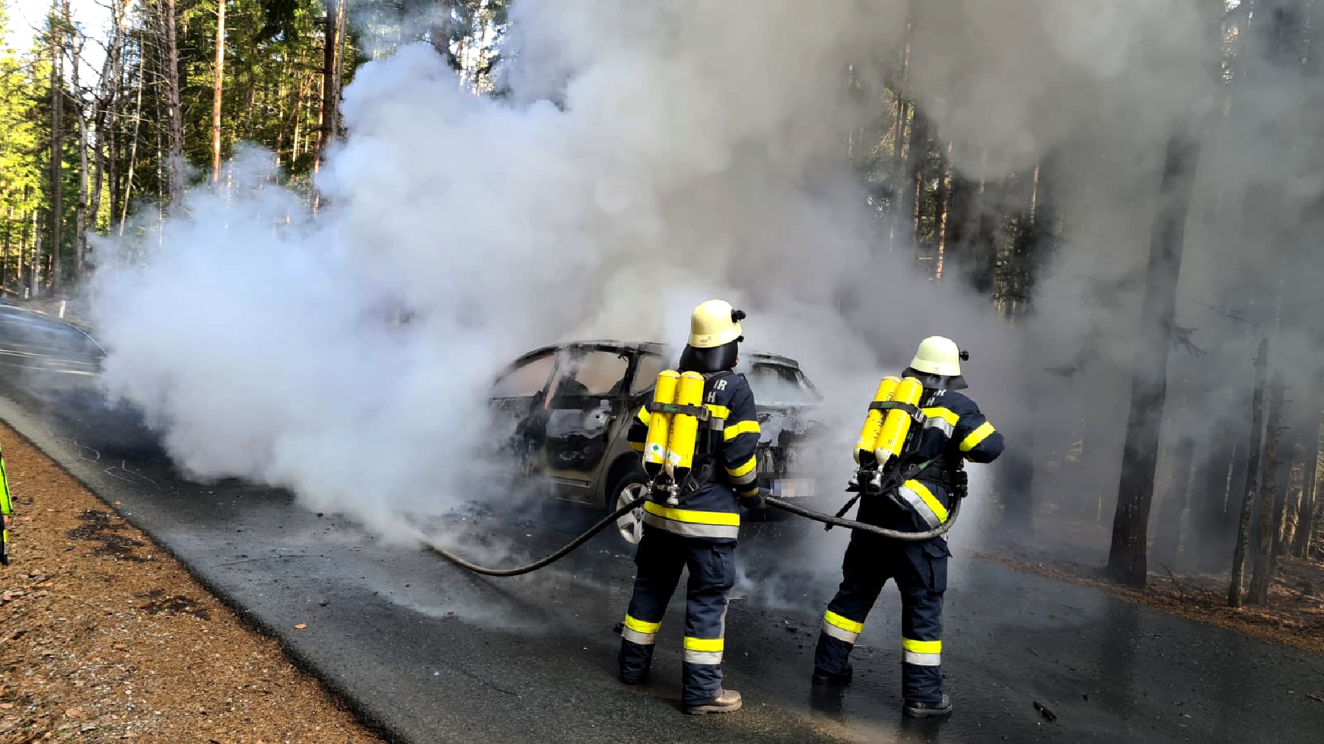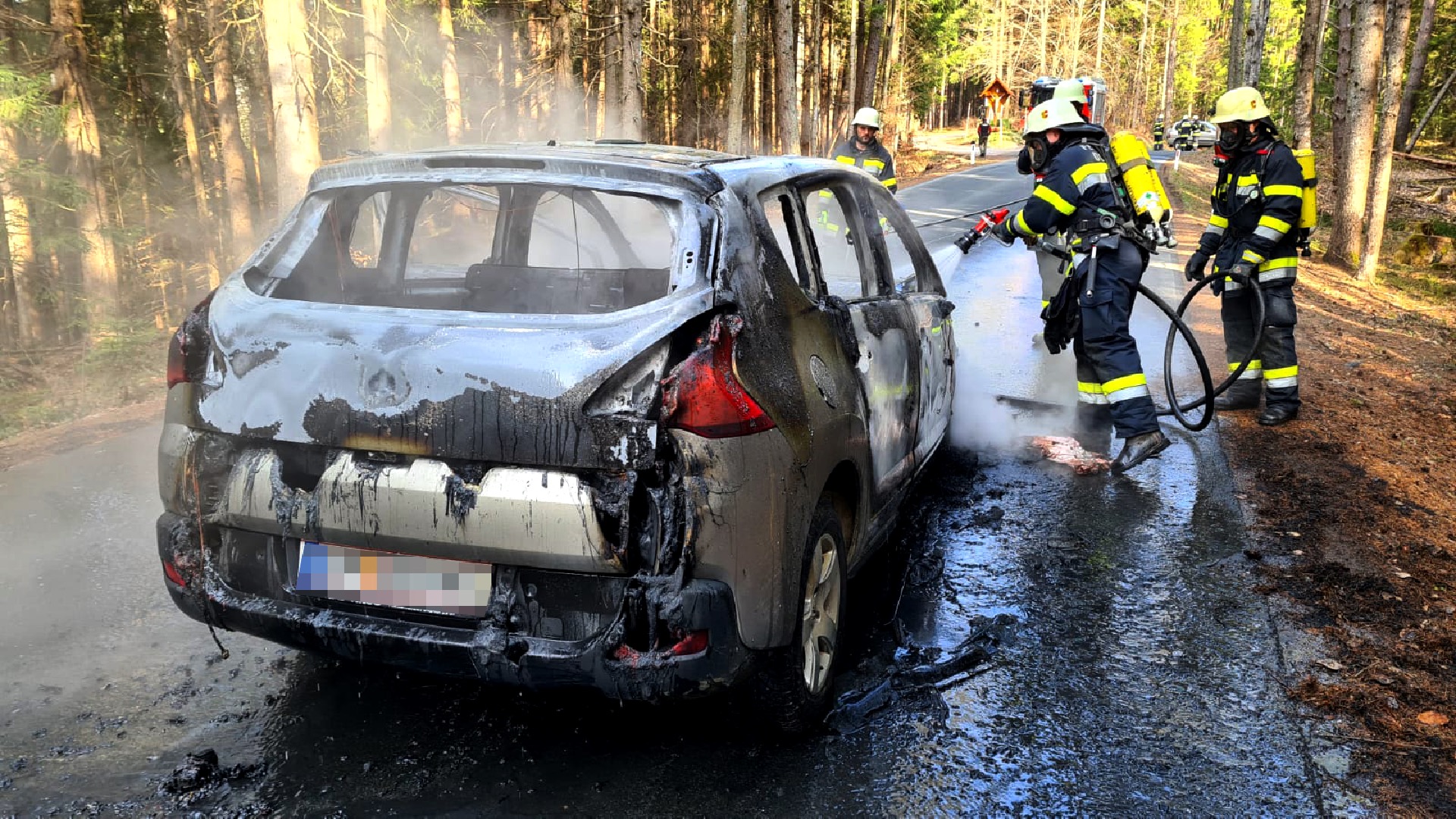 Der in Vollbrand stehende PKW wurde durch die beiden Feuerwehren unter schwerem Atemschutz gelöscht. Die umliegenden Bäume fingen aufgrund der starken Hitzeentwicklung ebenfalls Feuer. Das Fahrzeug brannte vollständig aus, es kam jedoch zu keinem Personenschaden. Während der Lösch- und Aufräumarbeiten war die Straße für über eine Stunde vollständig gesperrt.