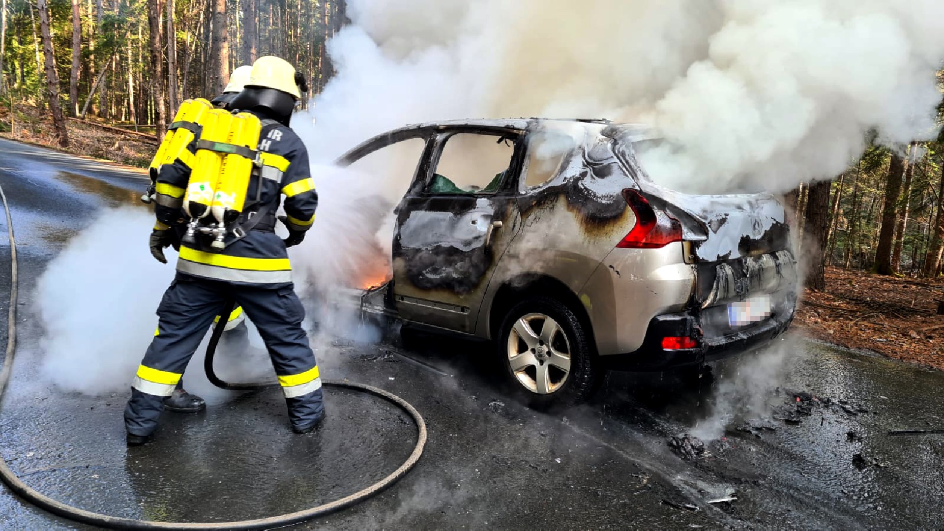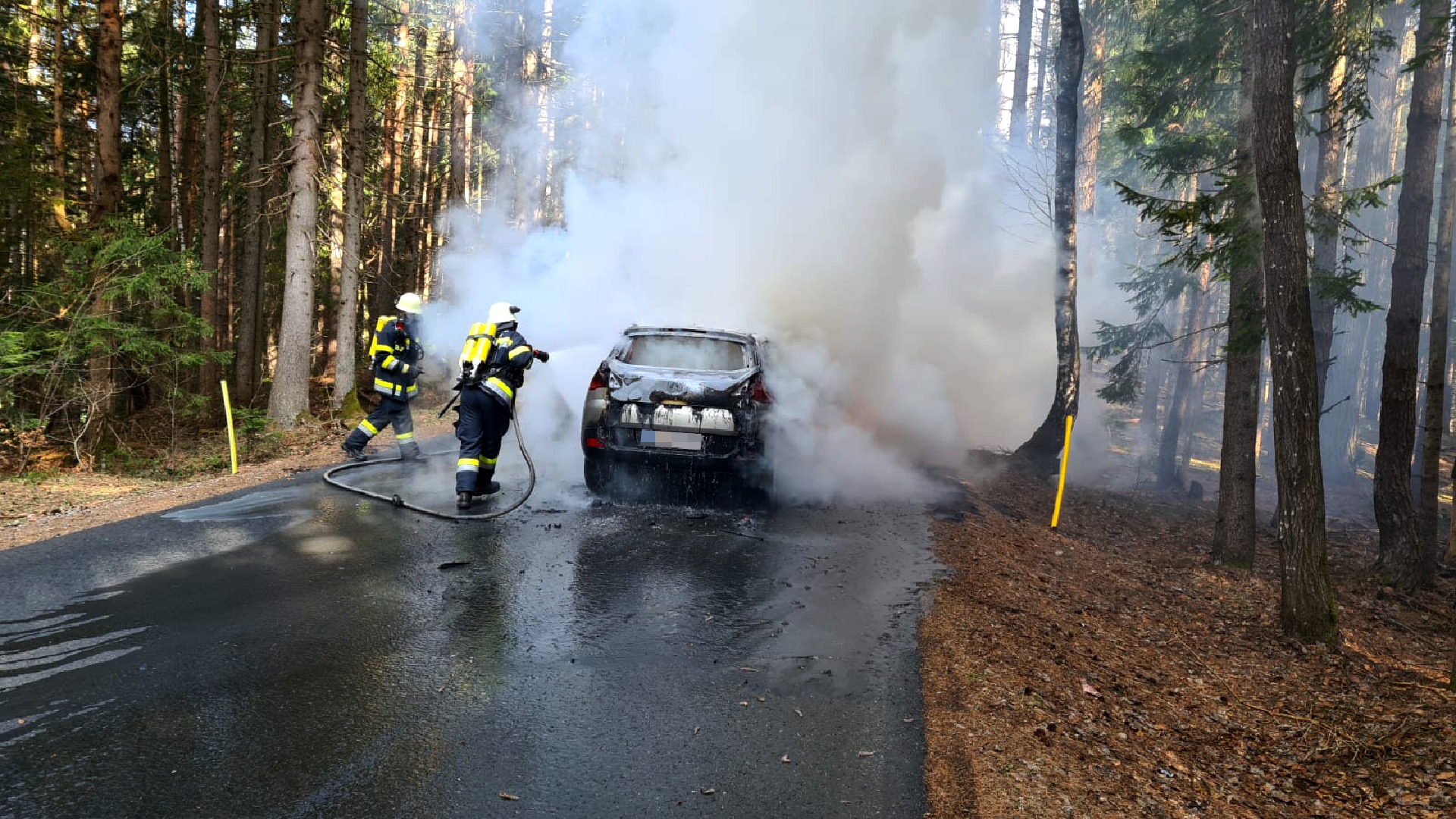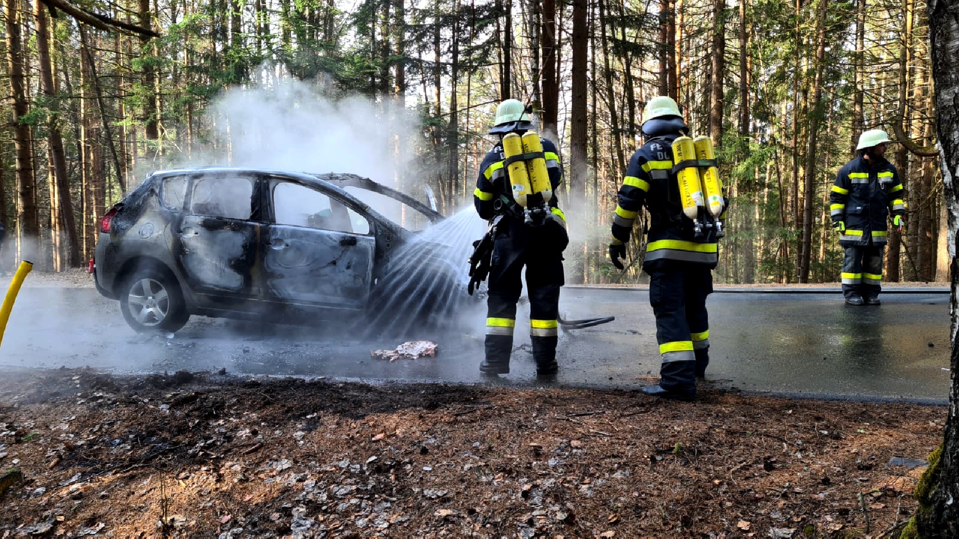 Der in Vollbrand stehende PKW wurde durch die beiden Feuerwehren unter schwerem Atemschutz gelöscht. Die umliegenden Bäume fingen aufgrund der starken Hitzeentwicklung ebenfalls Feuer. Das Fahrzeug brannte vollständig aus, es kam jedoch zu keinem Personenschaden. Während der Lösch- und Aufräumarbeiten war die Straße für über eine Stunde vollständig gesperrt.